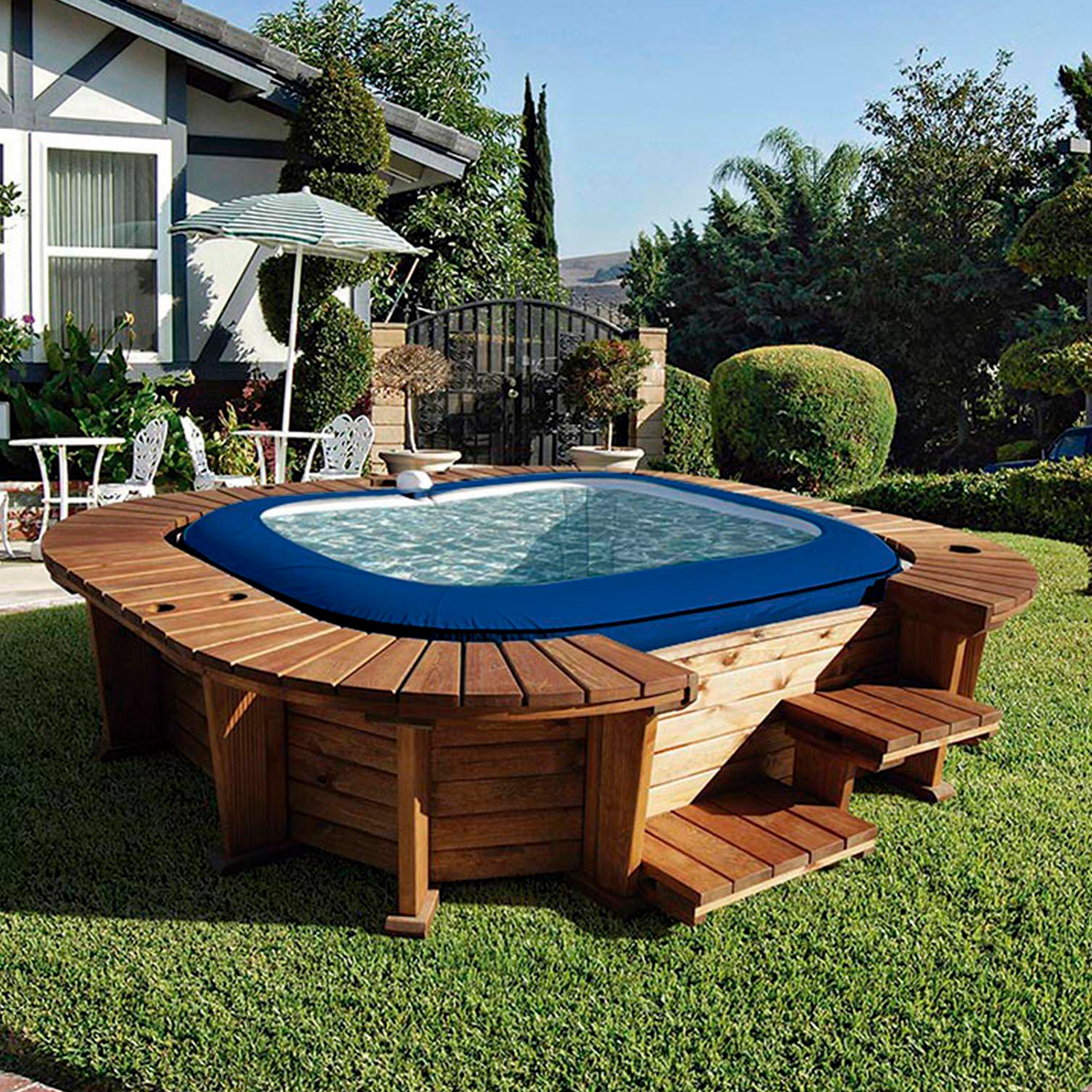 Les modèles de spas K2O allient le confort d'un spa amovible à la beauté de l'esthétique rustique procurée par sa structure faite à la main. La partie extérieure est fabriquée en bois de pin espagnol, certifié FSC et traité en autoclave de classe III pour une conservation optimale en extérieur. Il dispose d'un spa gonflable pouvant accueillir jusqu'à 6 personnes. C'est la solution portable et facile à installer pour en profiter à l'intérieur comme à l'extérieur. Il suffit de l'installer et de le regarder se gonfler avec la pompe intégrée en quelques minutes seulement. L'ensemble se compose d'un spa gonflable fabriqué en PVC de haute qualité et équipé d'un filtre de 1325 litres/heure pour éliminer la saleté de l'eau. Avec des mesures extérieures de 250 x 275 x 71 cm. Il dispose également d'un système de bain bouillonnant avec plus de 120 sorties d'air et chauffe l'eau jusqu'à 40ºC. Caractéristiques : - Structure extérieure : bois FSC. - Couleur du spa : bleu. - Pour 4-6 personnes. - Utilisation intérieure ou extérieure. - Facile à installer. - Forme : carrée. - Taille du spa : 180x180x71 cm. - Dimensions : 250 x 275 x 71 cm. - Capacité : 840 litres. - Panneau de commande numérique. - Purificateur 1.325 L/H. - Système AirJet : 120 sorties de bulles d'air. - Minuterie d'économie d'énergie. - Filtre à cartouche de type VI. - Distributeur de produits chimiques. - Couverture. - Patch de réparation.