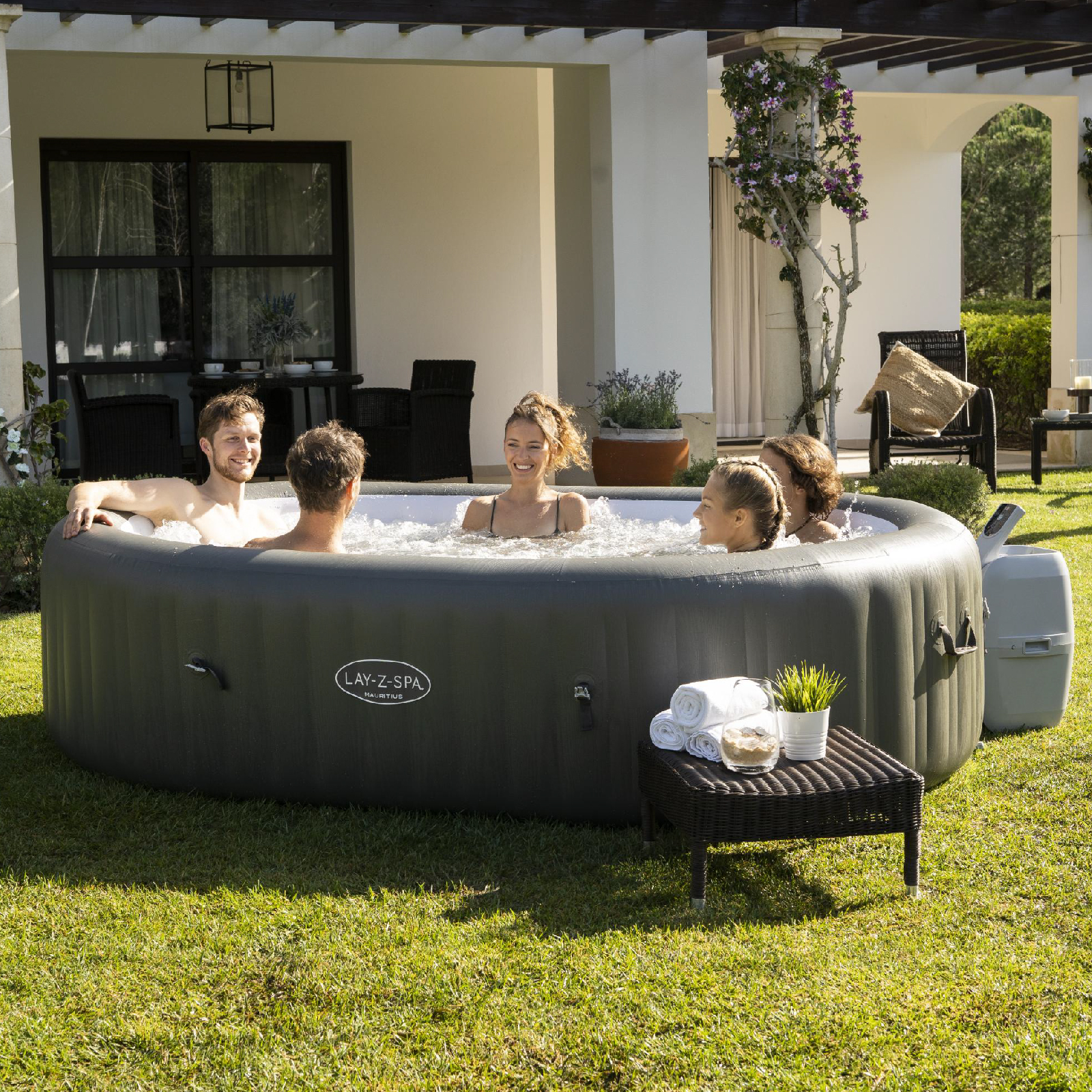 Libellé Spa Gonflable Bestway Lay-Z-Spa Mauritius Smart AirJet 270x180x71 cm pour 5-7 Personnes avec Airjet, Couverture et App Connectée
