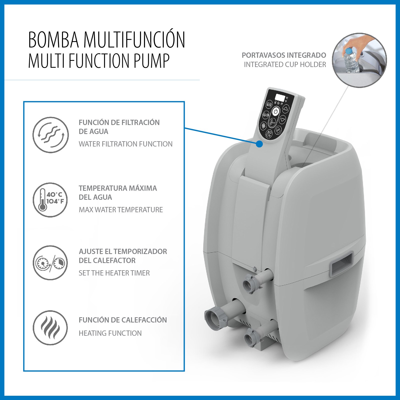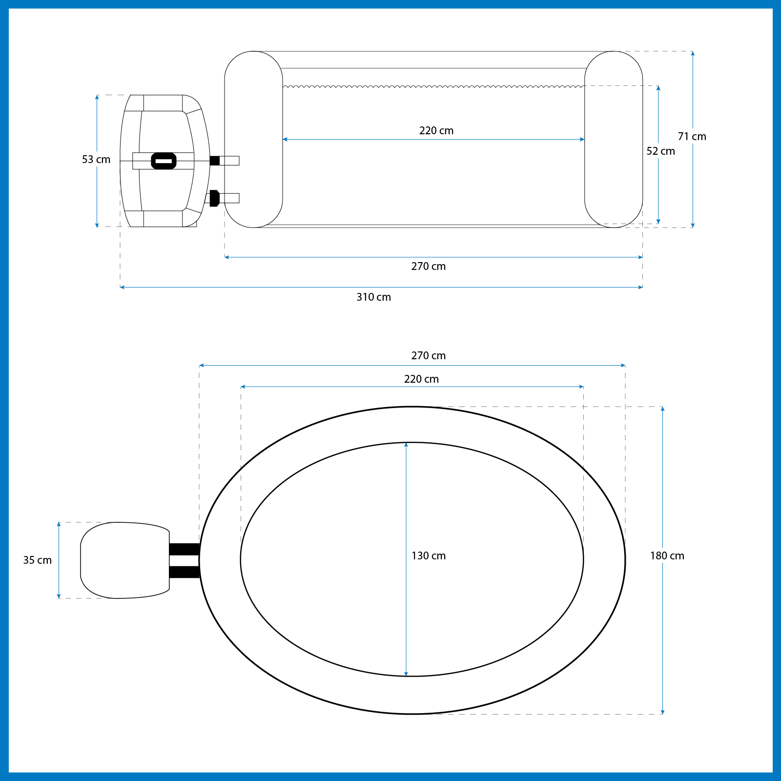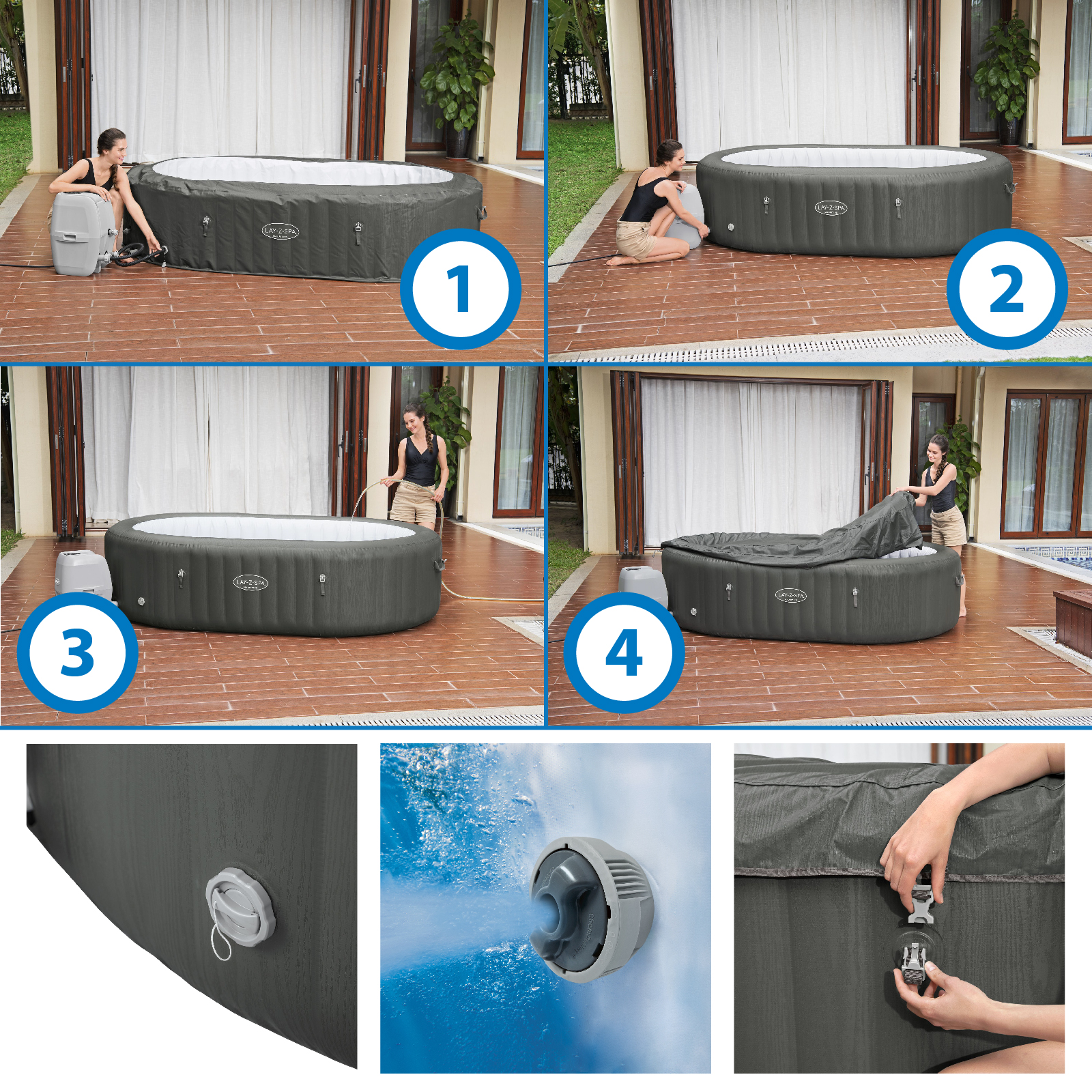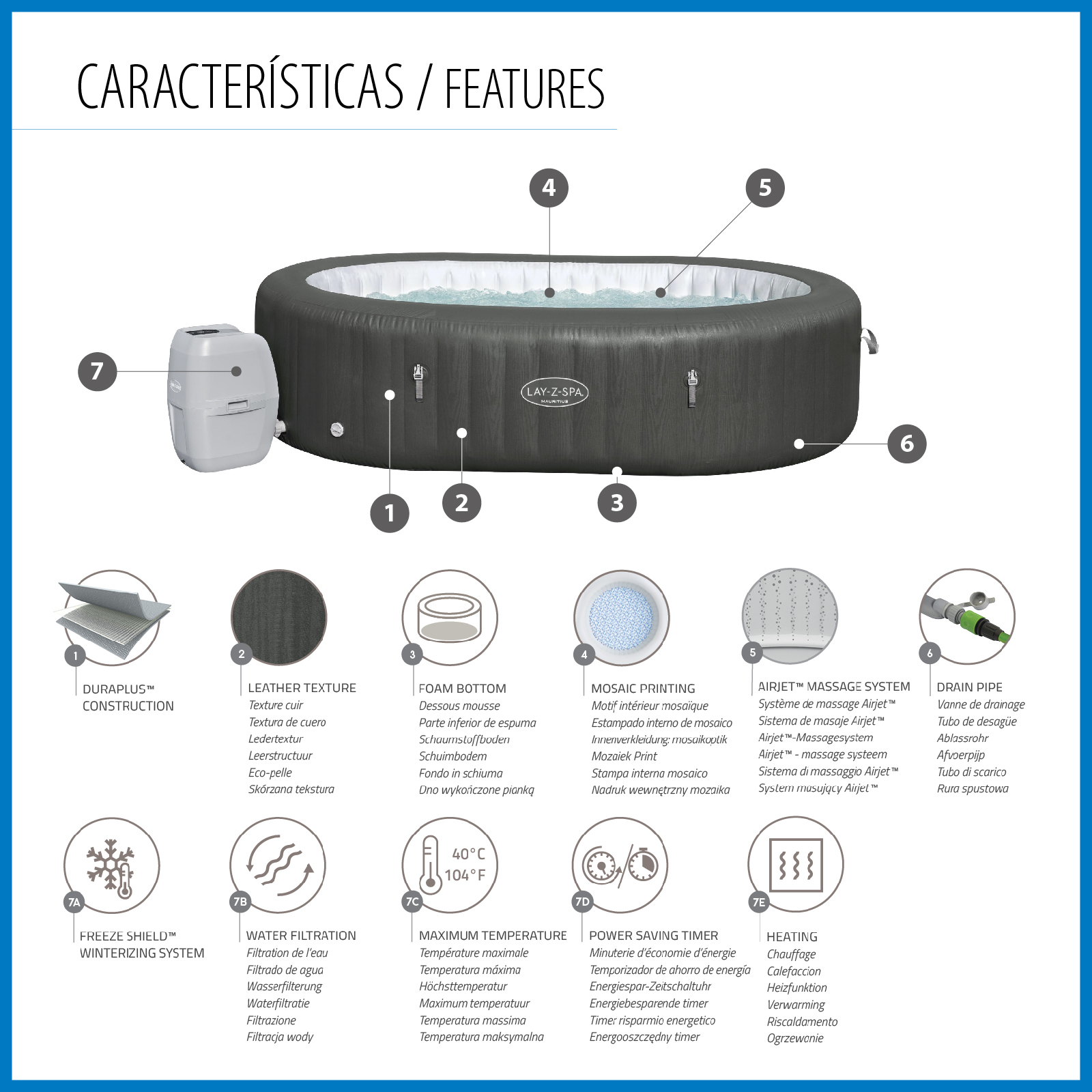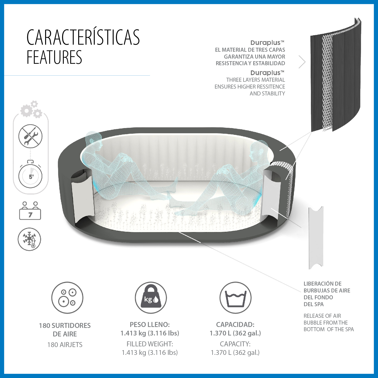 Le Lay-Z-Spa Mauritius Smart AirJet offre une expérience relaxante pour 7 personnes. Convenant aussi bien à l'intérieur qu'à l'extérieur, ce spa gonflable est facile à installer et a une pompe intégrée pour le gonfler. Doté de 180 orifices d'aération libérant des bulles apaisantes, sa structure de poutres internes DuraPlus durable et ses parois gonflables empêchent les perforations et préservent sa forme. La fonction de chauffage automatique Freeze Shield protège les composants internes du gel. La pompe de filtration de 1 325 L/h chauffe l'eau jusqu'à 40ºC, active la filtration et contrôle le massage via un panneau de commande numérique ou l'application Bestway Smart Hub. Le distributeur ChemConnect maintient l'eau propre avec le bon niveau de chlore. Il inclut des porte-verres pour votre boisson préférée et une couverture pour le protéger. Caractéristiques : - Couleur : Gris. - 5 à 7 pers. - Forme ovale. - Dimensions gonflé : 270x180x71 cm. Dimensions intérieures : 220x130 cm. - Capacité : 1.370 L. Poids total : 1,408 kg. - Épurateur 1.325 L/h. Filtre à cartouche VI. - Système AirJet : 180 sorties de bulles d'air. - Connexion avec l'application Bestway Smart Hub. - Minuterie d'économie d'énergie. - Distributeur de produits chimiques. - Couverture. Patch de réparation. *Il peut y avoir une légère variation entre la couleur numérique et la couleur réelle en raison de la luminosité, de la résolution et du contraste des images présentées. *Comme il s'agit d'un produit gonflable, les mesures sont approximatives.
