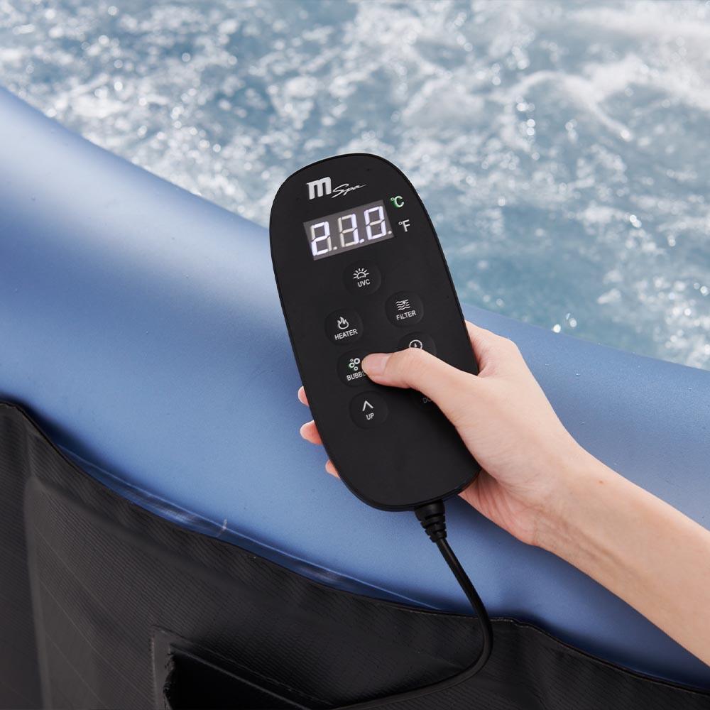 - INSTALLATION FACILE : ce spa est simple d'utilisation. La température, la mise en marche, la chauffe différée (TIMER) et les autres fonctionnalités se gèrent grâce à la télécommande filaire étanche. Le gonflage s'effectue par système automatique. Il suffit de brancher le spa et de tourner le bouton de gonflage, rien de plus simple ! La bâche isotherme qui sert de couvercle se relie à la structure par fermeture éclair. Le cadenas fourni verrouille l'installation pour garder la chaleur et éviter les accidents. La mise en place est facile et ne nécessite pas d'outil. En 10 minutes, le spa est installé et prêt à accueillir de l'eau.