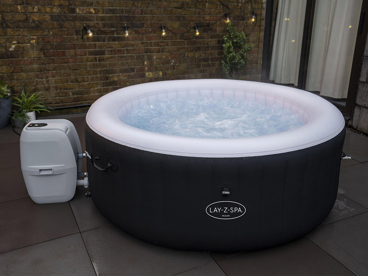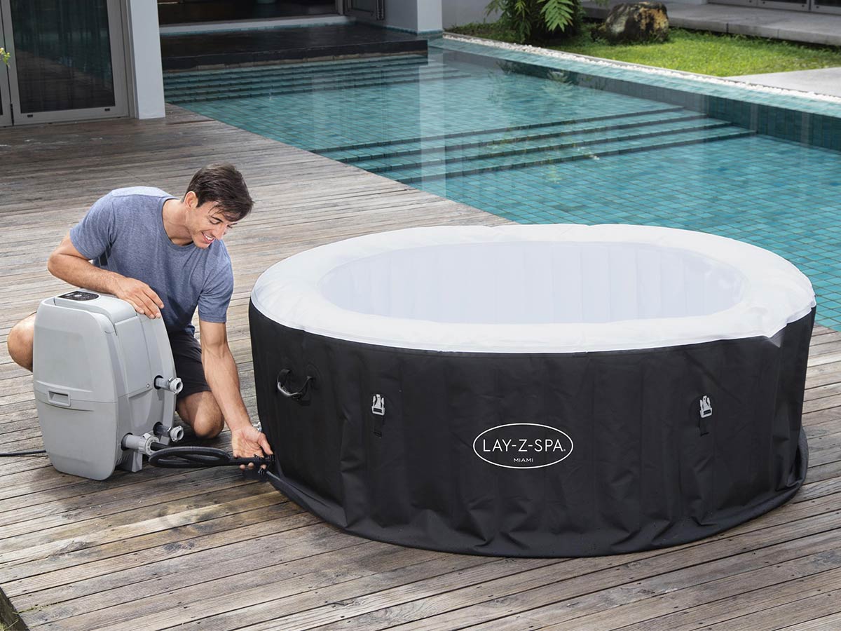 Spa gonflable Lay-Z-Spa Miami rond Airjet 4 places - BestwayVous allez pouvoir profitez pleinement d'un moment de relaxation avec ce spa gonflable rond Lay-Z-Spa Miami. Il est conçu pour accueillir de 2 à 4 personnes afin d'en profiter pleinement en famille, entre amis ou seul.Grâce à ses 120 jets d'air chaud Airjet, vous allez pouvoir vous décontracter entièrement dans les meilleures conditions.Le spa Lay-Z-Spa de Bestway vous permet de vous offrir un réel espace de détente, que se soit à l'intérieur comme à l'extérieur.Confortable et résistant, il dispose des dernières technologies de la marque Bestway : la technologie Duraplus pour la surface extérieure, le matériau Dropstitch pour les parois gonflées et la construction I-Beam pour l'intérieur de la structure.Il possède plusieurs accessoires : une couverture gonflable isolante, une filtration à cartouche et un diffuseur Chemconnect pour eau toujours propre et saine.• Nombre de places : 2/4 personnes• Volume d'eau (80%) : 669 L• Diamètre extérieur : 1,80 m• Diamètre intérieure : 1,32 m• Hauteur : 66 cm• Hauteur d'eau max : 52 cm• Longueur totale (spa + bloc technique) : 2,21 m• Poids rempli : 696 kg• Poids net : 27 kg• Débit de filtration : 1,3 m³/h soit 1 325 L/h• Système de chauffage : environ 1,5-2 °C/h• Température maximale : 40°C• Dimensions du colis (L x l x H) : 81 x 45 x 60 cm / Alimentation:Prise secteur / Amplitude:20 - 40 °C / Augmentation de la température:1,5 - 2°C/H / Augmentation de la Température:1,5 - 2 °C/H / Contenance:669 L / Couleur:Noir / Débit de filtration:1,3 m³/h / Diamètre extérieur:180 cm / Diamètre intérieur:132 cm / Diffuseurs à bulles:120 / Dimensions extérieures (L x l ou Ø):Ø 1,80 m / Dimensions intérieures (L x l ou Ø):Ø 1,32 m / Forme:Rond / Garantie:2 ans / Hauteur:66 cm / Jets massants:Non / Marque:BESTWAY / Matière(s):Duraplus / Nombre de places:4 / Poids:27 kg