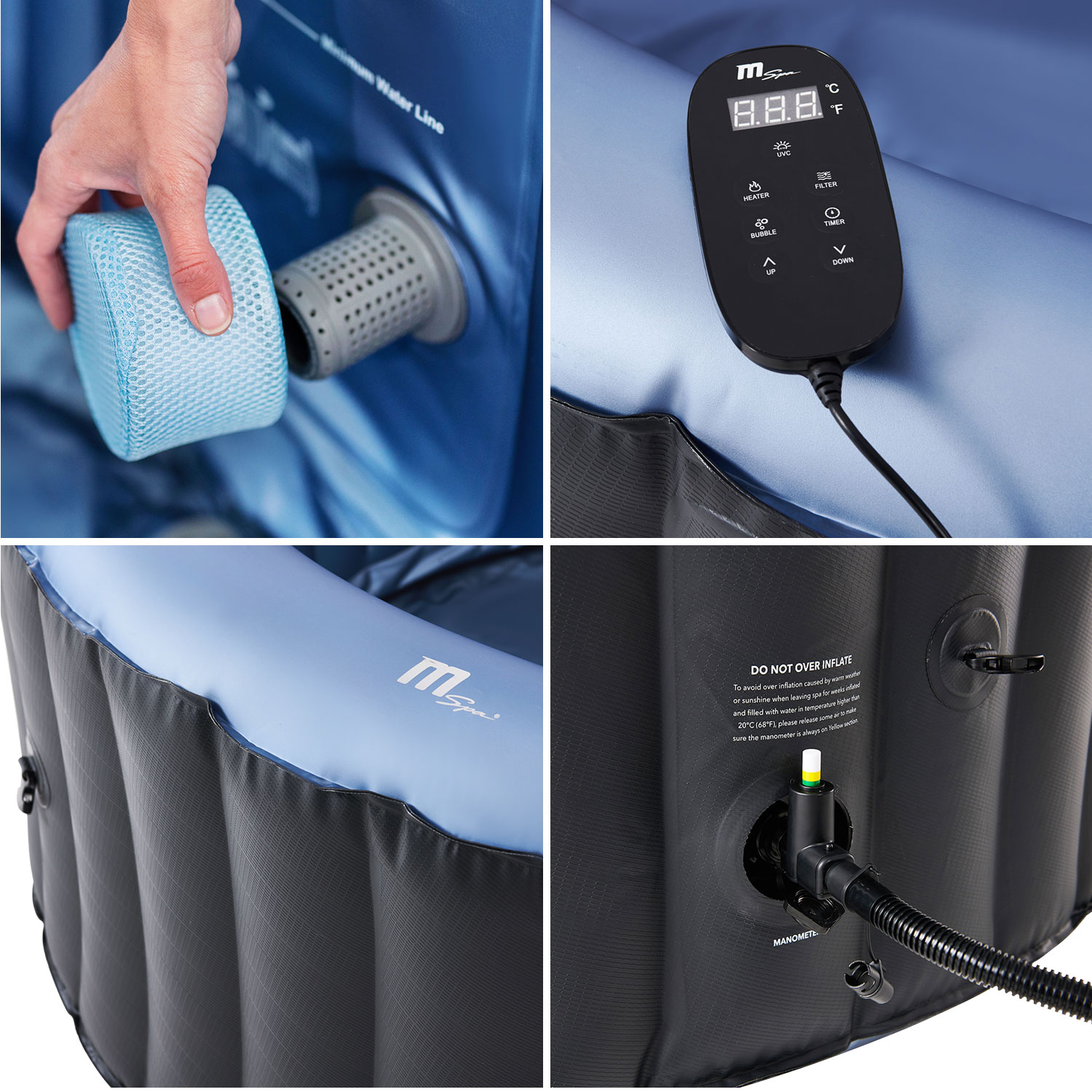 - Accessoires inclus : télécommande - cartouche de filtration - base de cartouche de filtration - tuyau de pompe avec manomètre - adaptateur de vidange - housse avec clips