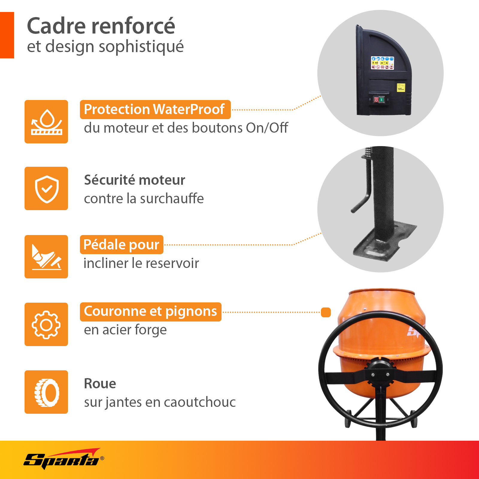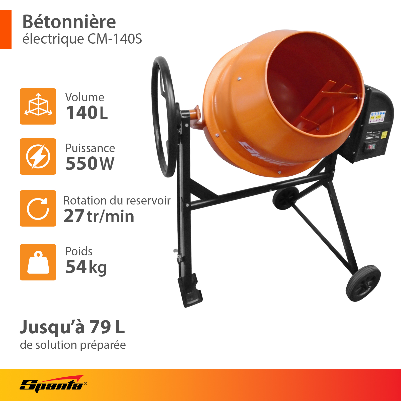 SPARTA – Bétonnière 140 L CM-140S – 550 W Bétonnière qualité professionnelle, conception de qualité, solide et durable. L’allié parfait pour vos travaux de maçonnerie ! La bétonnière SPARTA est conçue pour répondre aux besoins des particuliers et des professionnels, notamment sur des chantiers, pour des travaux de construction.Elle permet de simplement et aisément préparer un mélange de béton ou une solution pour couler des chapes, des fondations ou autres travaux de maçonnerie. Capacité de production et contenance La bétonnière CM-140S dispose d’une cuve de 140 Let vous permettra donc de concevoir jusqu’à 79 L de mélange en une seule fois ! Efficacité et robustesse Elle est conçue de manière à assurer robustesse et efficacité, en effet elle est dotée de : • Une couronne et des engrenages en fonte• Un cadre renforcé en deux parties avec raidisseurs solides permettant la fiabilité de la structure• Un joint en caoutchouc permettant le montage / démontage facile de la cuve, et une étanchéité accrue• Une cuve de forme ingénieuse, élargie, avec des pâles installées à l’intérieur du tambour permettant un meilleur mélange de la solution.• Une peinture de qualité 100% anticorrosion Sécurité avant tout De plus, elle permet une utilisation en toute sécurité grâce à sa protection contre la surchauffe : un capteur de température éteint le moteur en cas de température trop élevée. Cela permet de préserver l’intégrité du matériel et de protéger l’utilisateur d’éventuels accidents.Le moteur dispose d’une protection IP44 (contre la poussière et l’humidité).Aussi, l’engrenage d’entraînement est protégé par un boîtier étanche, ce qui élimine le risque de pénétration de corps étrangers dans le mécanisme et la panne de la machine. Caractéristiques Général Couleur(s) Orange, noir Modèles CM-140S Certifications et normes Certificat CE - Répond aux exigences de l'UE Pays d'origine Chine Plus produit • Jusqu'à 79 L de solution • Cadre renforcé en acier, pièces mécaniques en fonte • Peinture anti-corrosion Type de Produit Bétonnière Matières Métal Contenance / Capacité 140 L Matériaux à travailler Béton Capacité cuve / réservoir 140 l Mode de démarrage Electrique Moteur Puissance électrique (W) 550 W Type d'alimentation Electrique Puissance du moteur en W 550 W Tension (En V) 230 V Niveau sonore 81 db Informations complémentaires Système de sécurité • Protection contre la surchauffe • Protection IP44 Précautions d'emploi Éviter la surcharge de la cuve Conseil d'entretien Vérifier l'état des pièces mécaniques toutes les 200 h Température de fonctionnement de -20° à +55°C Dimensions et poids Dimensions • L : 1143 mm • l : 835 mm • h : 1350 mm Poids 54 kg
