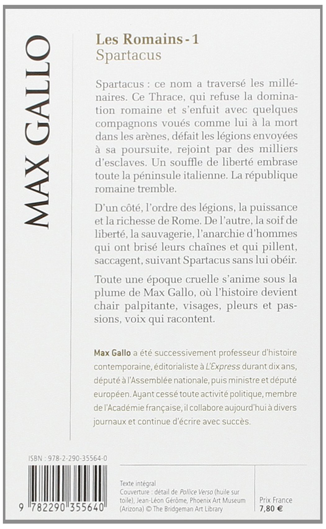 Roman Spartacus : ce nom a traversé les millénaires. Ce Thrace, qui refuse la domination romaine et s'enfuit avec quelques compagnons voués comme lui à la mort dans les arènes, défait les légions envoyées à sa poursuite, rejoint par des milliers d'esclaves. Un souffle de liberté embrase toute la péninsule italienne. La République romaine tremble. D'un côté, l'ordre des légions, la puissance et la richesse de Rome, César, Crassus, Pompée. De l'autre, la soif de liberté, la sauvagerie, l'anarchie d'hommes qui ont brisé leurs chaînes et qui pillent, saccagent, suivant Spartacus sans lui obéir. Toute une époque cruelle s'anime sous la plume de Max Gallo, où l'histoire devient chair palpitante, visages, pleurs et passions, voix qui racontent.