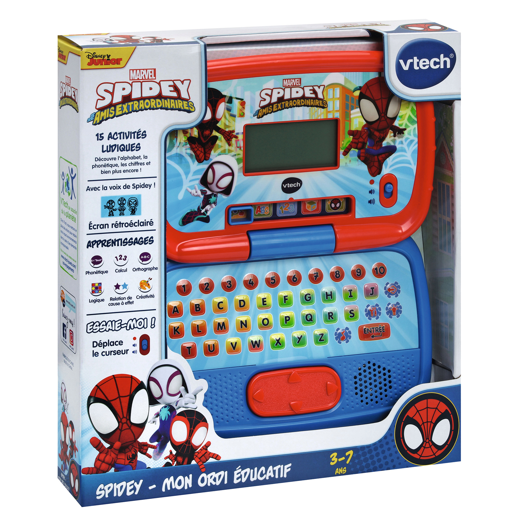Spidey - Mon ordi éducatif - 3 - 7 ans Un premier ordinateur pour apprendre et s’amuser avec Spidey ! - 15 activités pour apprendre de manière ludique l’alphabet, les chiffres et les formes. - 5 modes de jeu : Lettres, Chiffres, Puzzle, Jeux et Musique. - Un pad directionnel pour naviguer dans les activités et faire comme les grands. Avec un écran LCD et un clavier abécédaire. Avec la vraie voix des personnages de Spidey. Réglage du volume sonore et arrêt automatique. Boîte Try-me. Fonctionne avec 2 piles LR6 fournies.