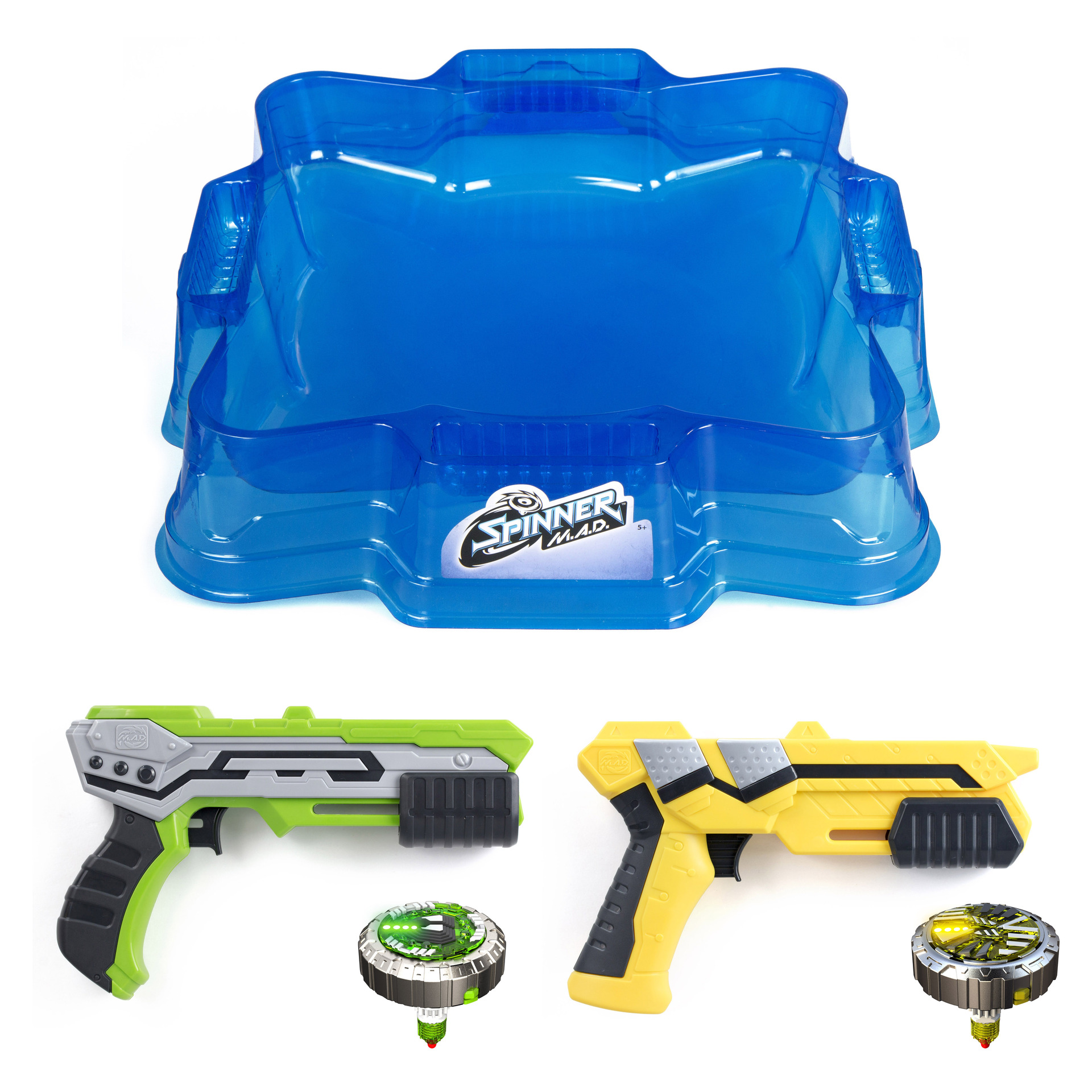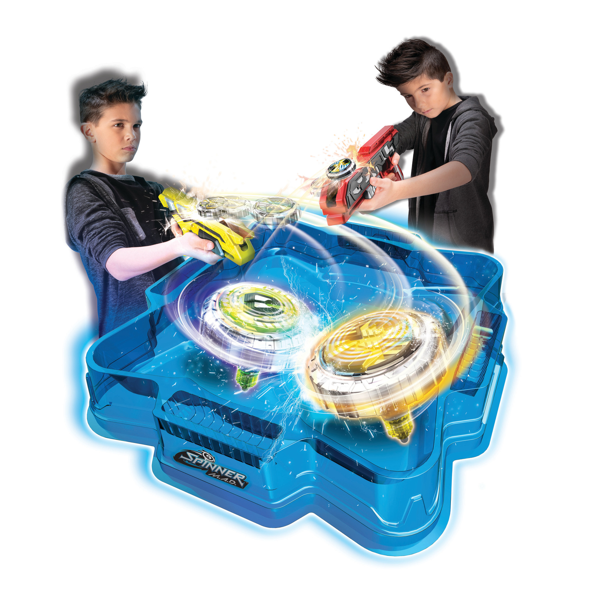 Spinner Mad - Deluxe pack combat 2 joueurs. Le set ultime pour des heures de combat et défier tes adversaire dans l'arène mythique ! Enclenche ta toupie sur ton blaster et recharge pour donner de plus en plus de vitesse à ta toupie lumineuse. Appuie sur la gachette et que le meilleur gagne ! Inclus : 1 arène, 2 blasters et 2 toupies LED. Compatible avec l'ensemble de la gamme Spinner Mad. A partir de 5 ans.