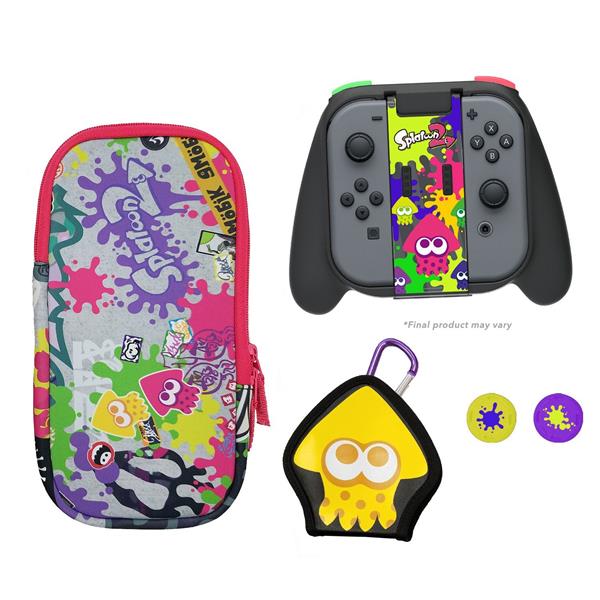 Starter Kit coloré pour Splatoon 2 Contient: 3 éléments : 1x Sacoche souple 1x Boîte de jeu calamar 4 jeux 2x Grips joysticks 1x Grip Joy-Con avec gâchettes.