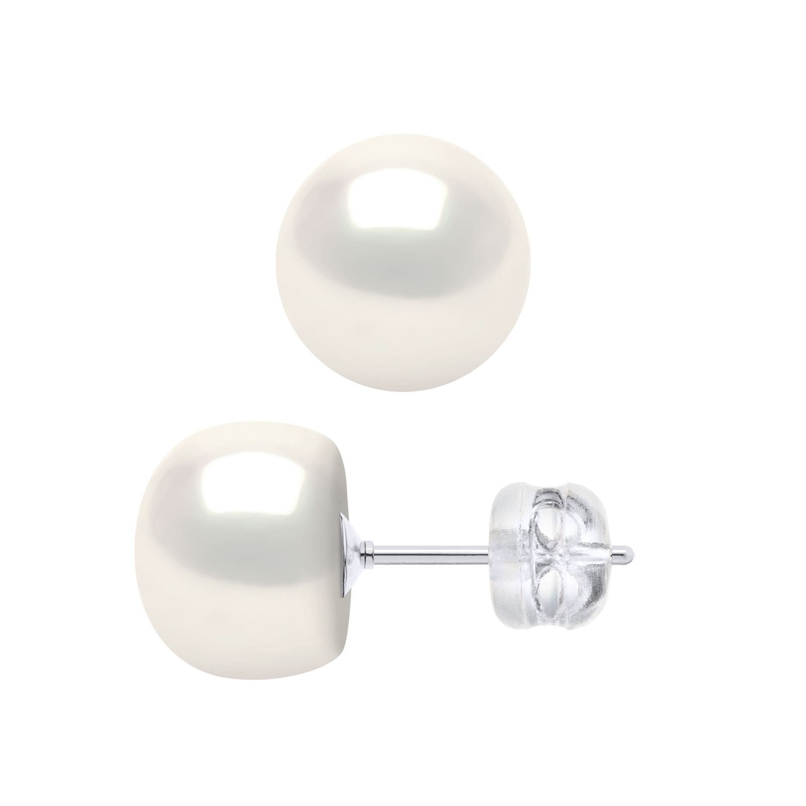 Boucles d'Oreilles en Or Blanc 375 Millièmes orné de Véritables Perles de Culture d'Eau Douce BOUTONS 8-9 mm - Colori Blanc Naturel - Système Poussettes SECURITE SILICONOR - Livré avec Certificat d'Authenticité et de Garantie - Frabriqué en FRANCE