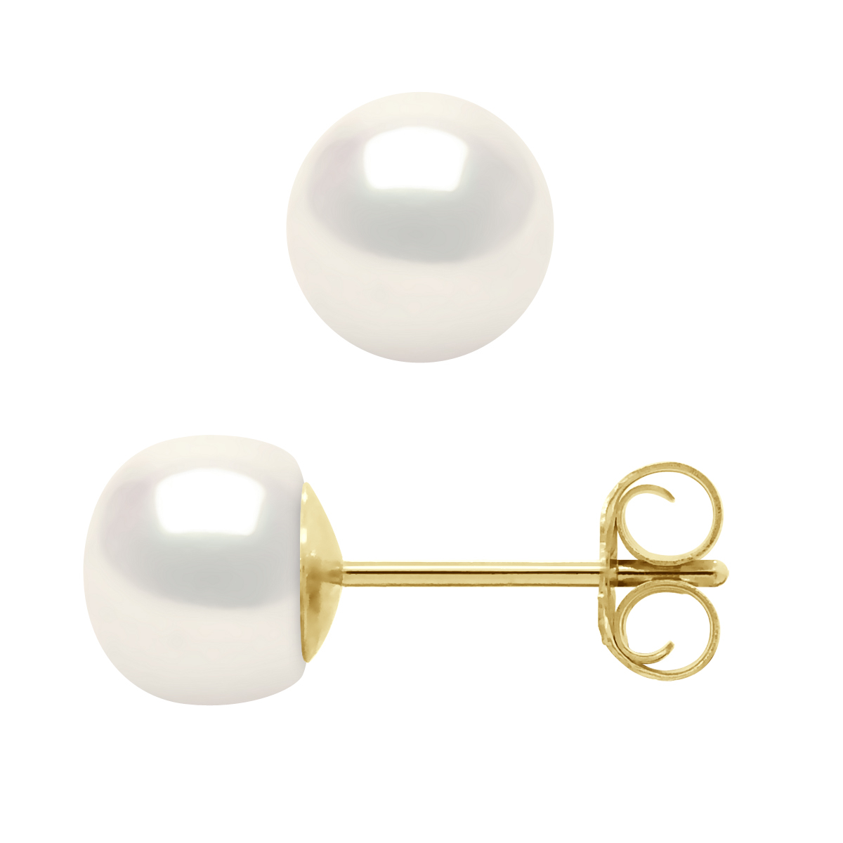 Boucles d'Oreilles en Or Jaune 375 Millièmes orné de Véritables Perles de Culture d'Eau Douce BOUTONS 6-7 mm - Colori Blanc Naturel - Système Poussettes - Livré avec Certificat d'Authenticité et de Garantie - Frabriqué en FRANCE