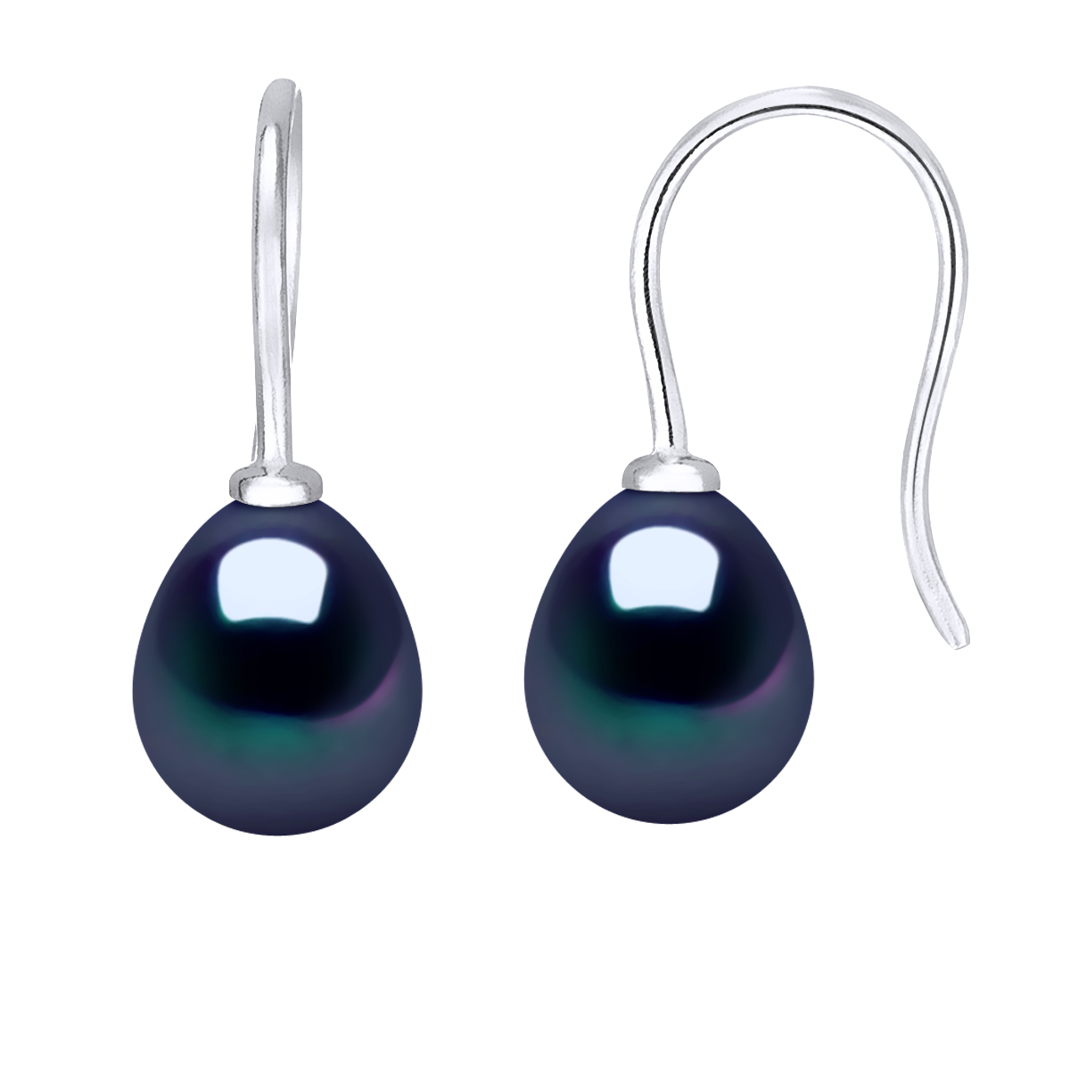 Boucles d'Oreilles en Or Blanc 375 Millièmes orné de Véritables Perles de Culture d'Eau Douce POIRES 7-8 mm - Colori Black Tahiti - Système Crochet - Livré avec Certificat d'Authenticité et de Garantie - Frabriqué en FRANCE