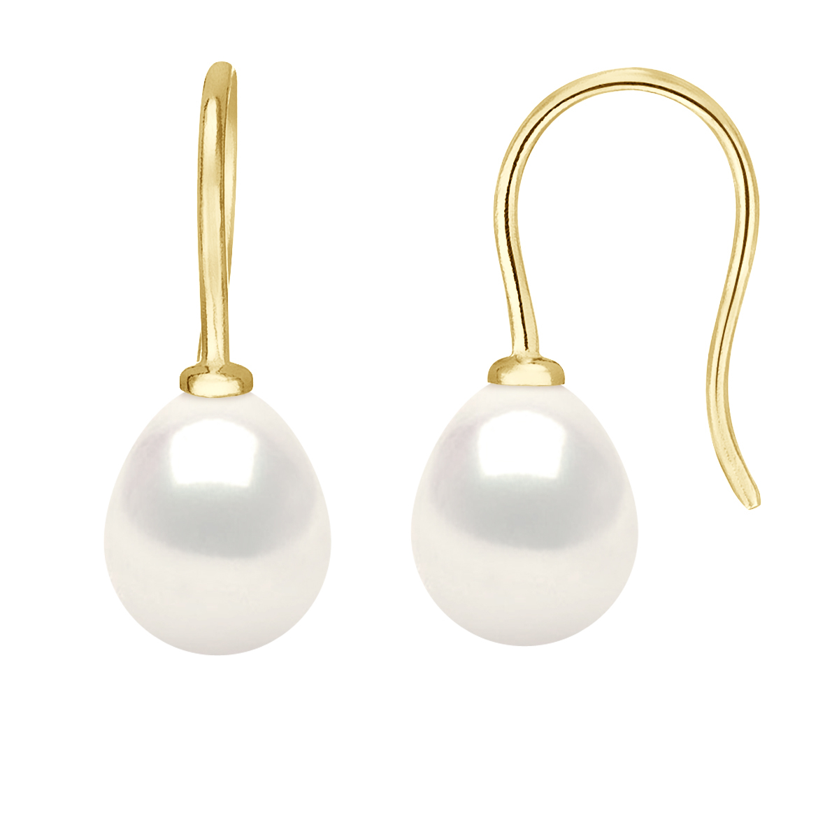Boucles d'Oreilles en Or Jaune 375 Millièmes orné de Véritables Perles de Culture d'Eau Douce POIRES 7-8 mm - Colori Blanc Naturel - Système Crochet - Livré avec Certificat d'Authenticité et de Garantie - Frabriqué en FRANCE