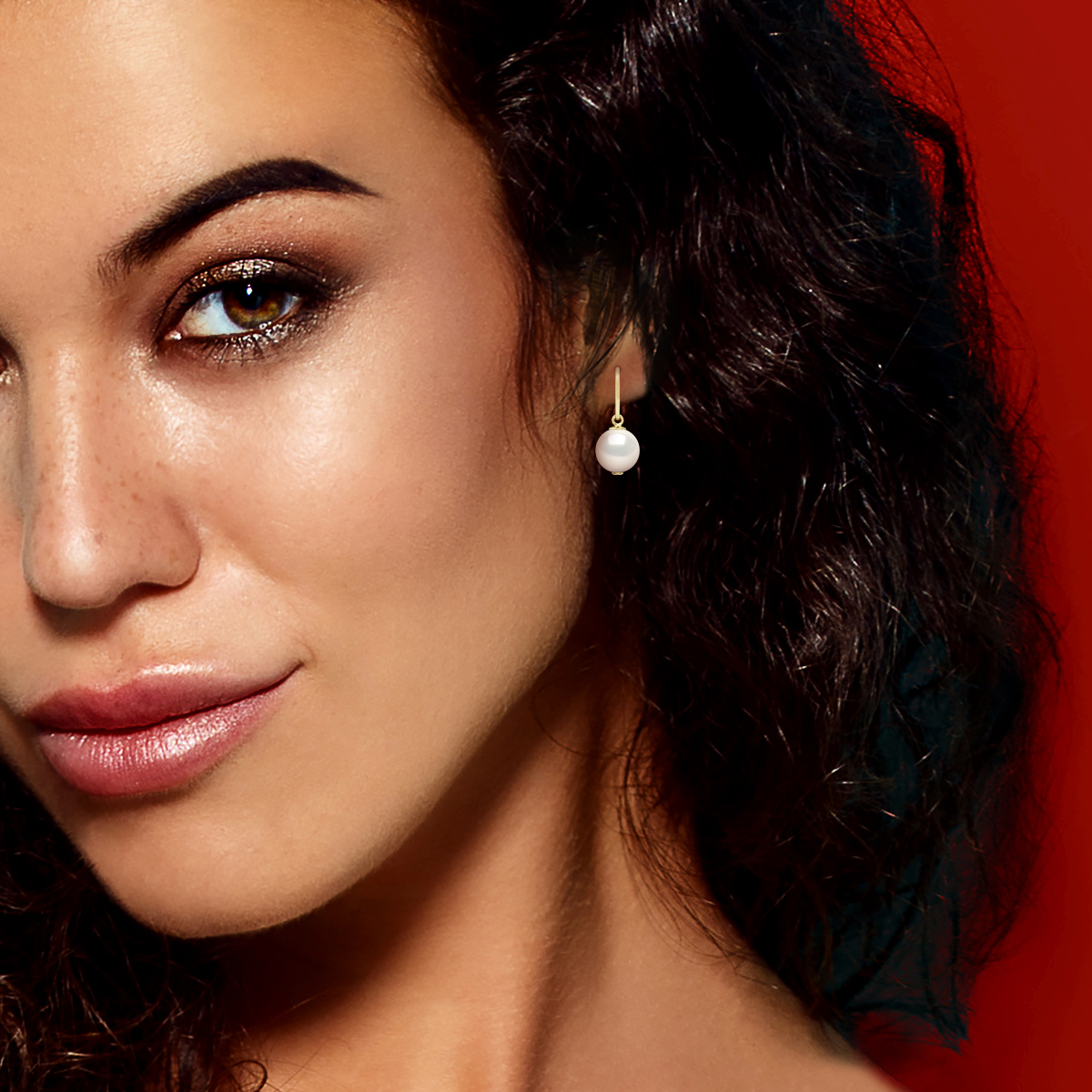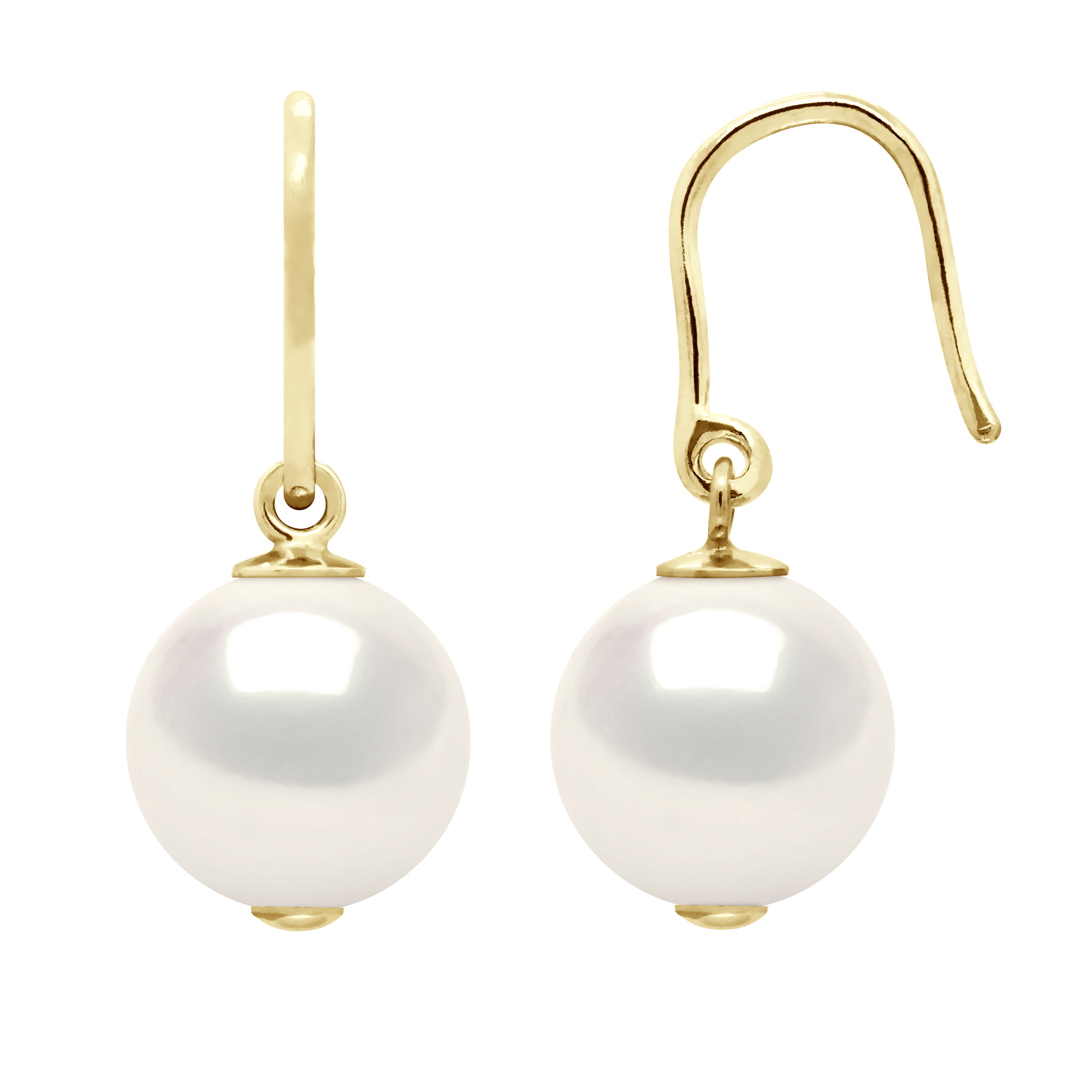 Boucles d'Oreilles en Or Jaune 375 Millièmes orné de Véritables Perles de Culture d'Eau Douce RONDES 9-10 mm - Colori Blanc Naturel - Système CROCHET ARTICULE - Livré avec Certificat d'Authenticité et de Garantie - Frabriqué en FRANCE
