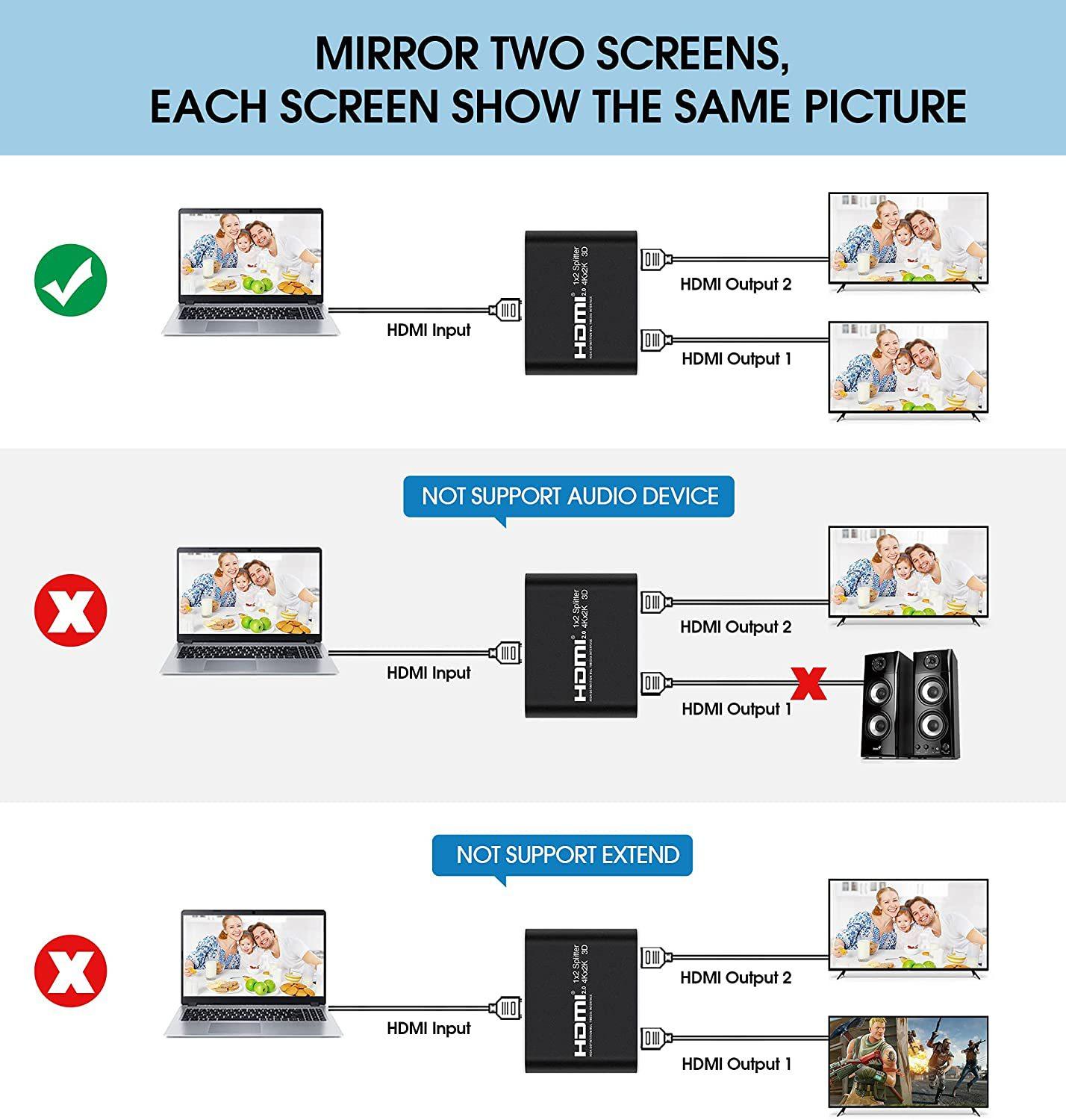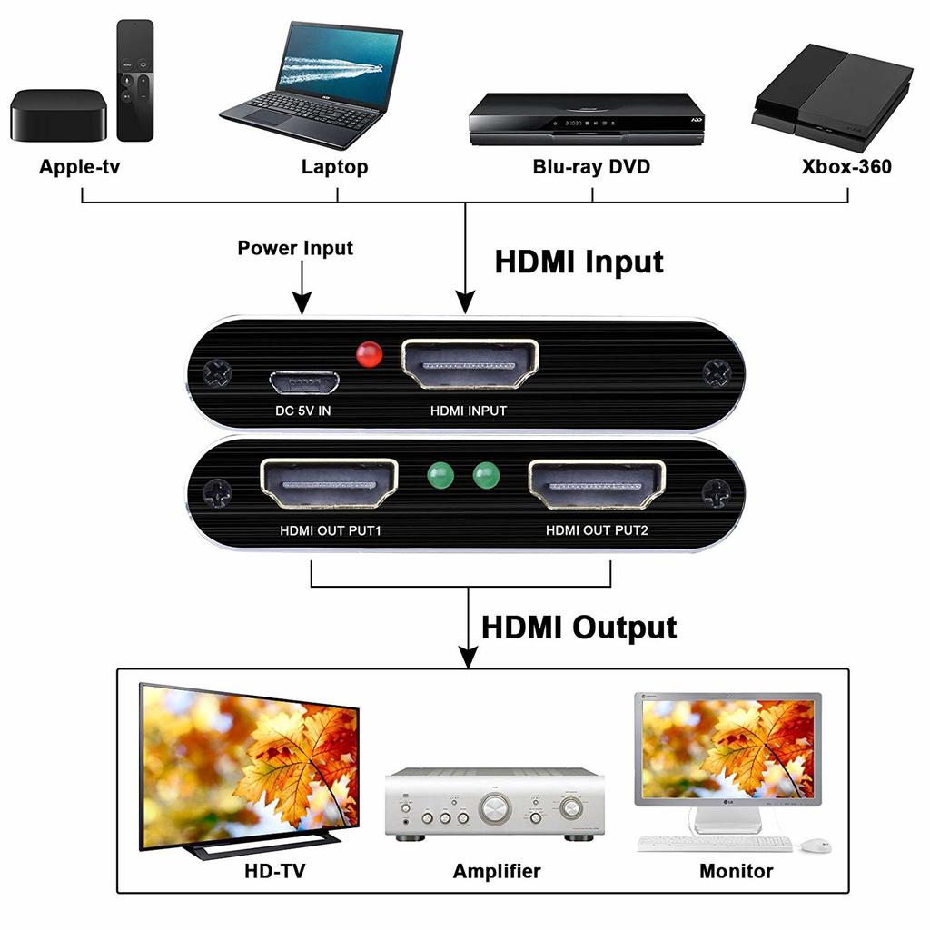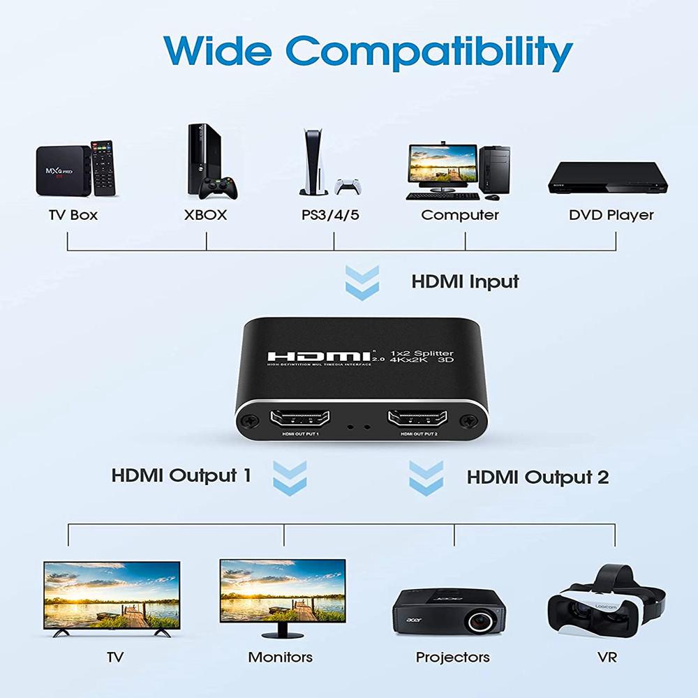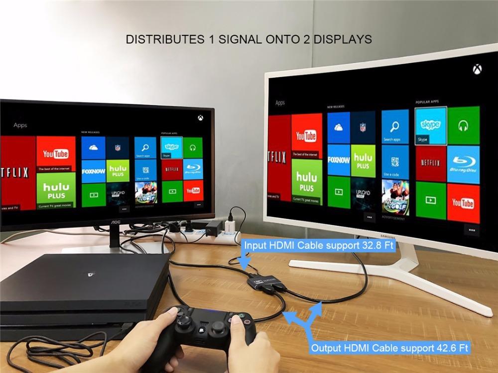 Compatibilité : Le répartiteur HDMI divise le contenu d'un appareil HDMI tel qu'une Playstation, une Xbox ou un lecteur Blu-ray vers deux écrans compatibles HDMI.