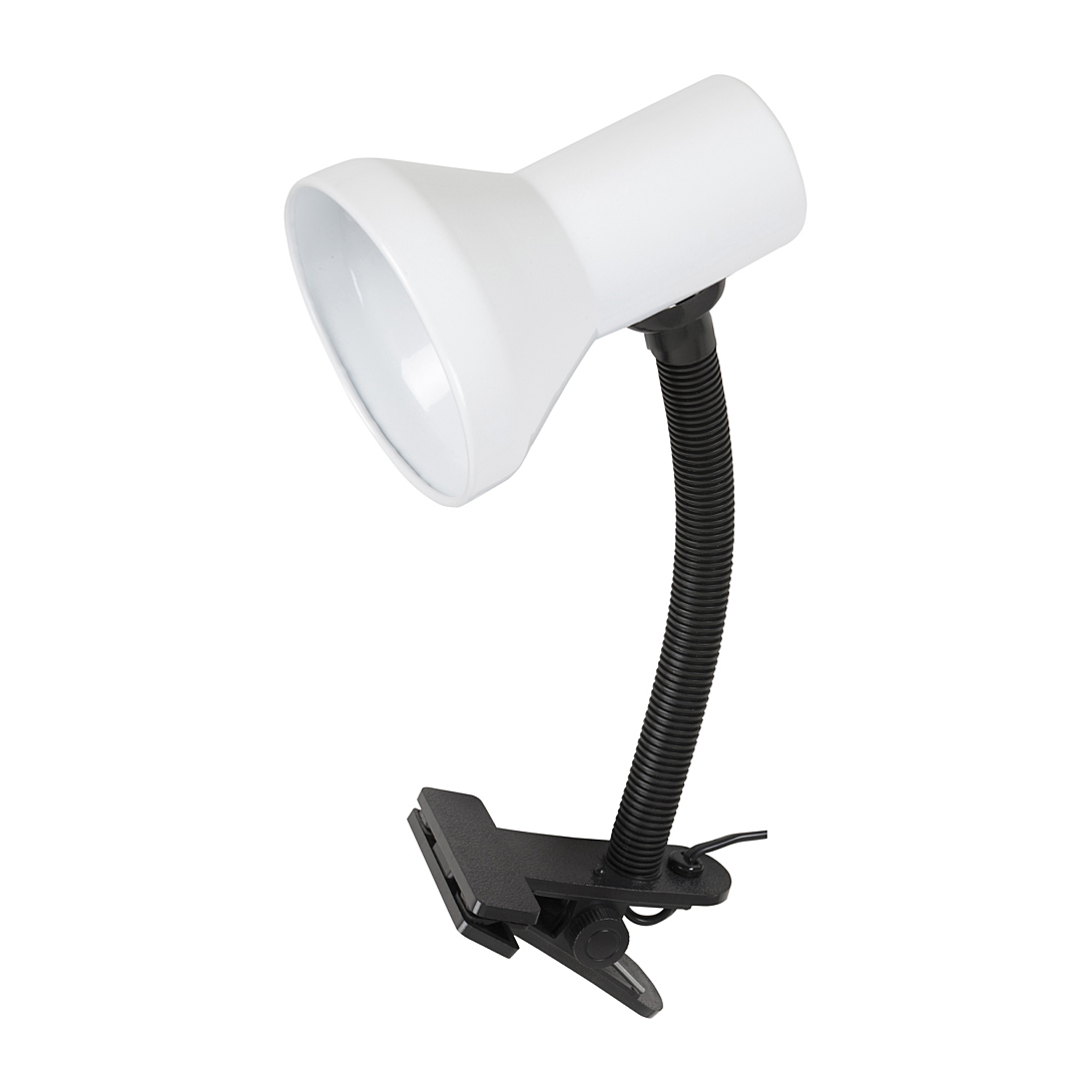 Spot à pince en métal avec peinture brillante. Equipé d'une tige flexible en plastique. Coloris : blanc. D10,50cm-H23,50cm. IP20. Classe 2. E14-15W.