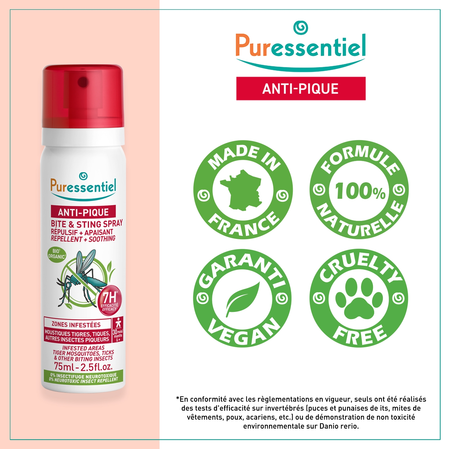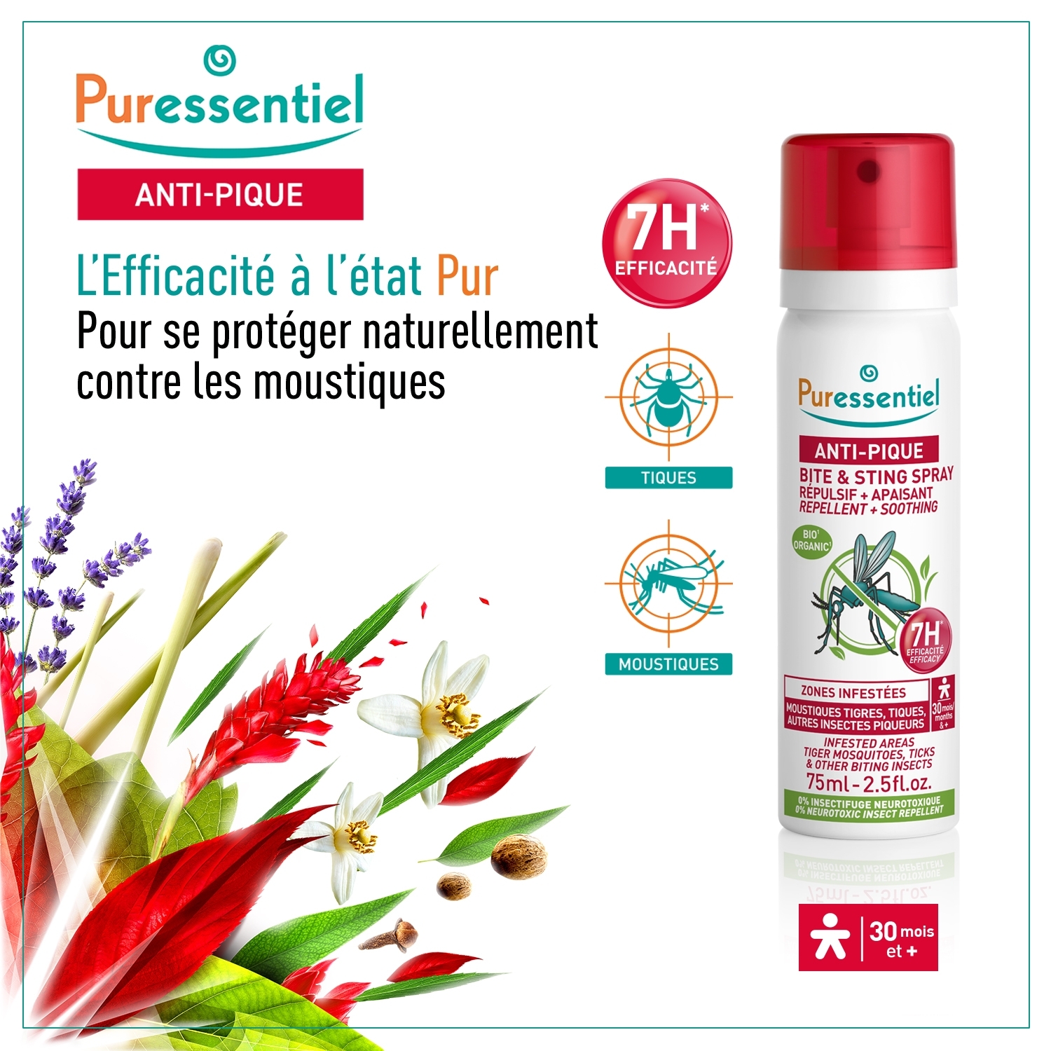 Le spray Anti-pique a une double action : Répulsif et Apaisant. - Répulsif : à base d'un puissant actif d’origine végétale dérivé de l'huile essentielle d’Eucalyptus citronné, il repousse efficacement les moustiques en zones infestées, tempérées et tropicales et d'autres insectes piqueurs (tiques, phlébotomes). Il est l’un des gestes possibles de protection notamment contre les vecteurs de zika, du paludisme, de la dengue, de la fièvre jaune, du chikungunya et de la maladie de Lyme. Efficacité testée en laboratoire : jusqu’à 7 heures* sur les moustiques tigres (Aedes albopictus) et communs (Culex pipiens), les phlébotomes (Phlebotomus duboscqi) ; jusqu’à 6 heures 30 sur les moustiques tropicaux (Aedes aegypti et Anopheles gambiae) ; jusqu'à 5 heures sur les tiques (Ixodes ricinus). La baignade ou la transpiration peuvent réduire la durée de protection. - Apaisant : Grâce aux 5 huiles essentielles BIO1 (Citronnelle de Java, Lavandin Grosso, Niaouli, Menthe Poivrée et Tea tree) pour procurer un effet apaisant sur les piqûres d'insectes. 0% insectifuge neurotoxique - Sans gaz propulseur Existe aussi en format 200ml *Efficacité testée en laboratoire : jusqu’à 7 heures sur les moustiques tigres (Aedes albopictus) et communs (Culex pipiens), les phlébotomes (Phlebotomus duboscqi) ; jusqu’à 6 heures 30 sur les moustiques tropicaux (Aedes aegypti et Anopheles gambiae) ; jusqu'à 5 heures sur les tiques (Ixodes ricinus). La gamme Anti-pique Puressentiel est votre bouclier 100% naturel contre les moustiques et autres insectes piqueurs: -Protéger votre peau avec les répulsifs cutanés Sprays (Bébé, 75ml,200ml et le spécial peaux sensibles 100ml à partir de 6 mois) -Protéger vos vêtements et tissus avec le spray répulsif vêtements et tissus idéal pour les vêtements, sacs de couchage, moustiquaires, rideaux, tentes poussettes... -Protéger votre maison avec le complexe diffuse citronnelle et les diffuseurs Puressentiel -Apaiser vos piqûres avec le roller apaisant cutané aux 11 huiles essentielles. Pratique et nomade il vous suivra partout. Pour les zones étendues, la crème-multi apaisante (30ml bébé et 40ml enfant à partir de 3ans) soulagera vos piqûres et démangeaisons.