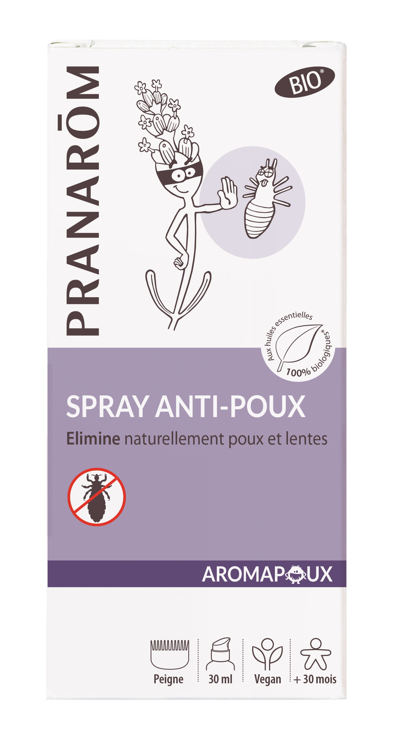 Pranarôm Aromapoux Spray Anti-Poux Bio 30 ml est un spray à base d'huiles essentielles qui permet d'éliminer efficacement les poux et les lentes du cuir chevelu. Ce spray agit mécaniquement en bloquant les orifices respiratoires des poux et détruit l'enveloppe de la lente grâce à sa composition à base d'extraits d'huile de Coco* et d'huile végétale de noyau d'abricot*. Les huiles essentielles de Tea Tree, de Lavandin, d'Anis et d'Ylang-Ylang complètent cette formule efficace pour l'élimination totale des poux et des lentes. Le peigne vous permettra de compléter l'action du spray et d'enlever les lentes et les poux morts.