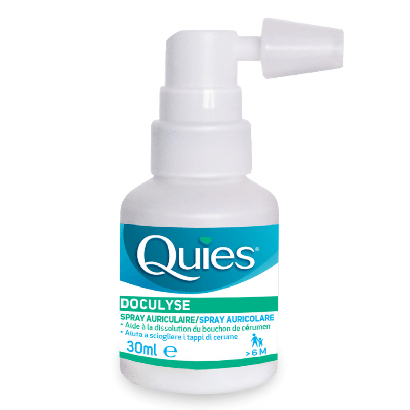 Quies Doculyse Spray auriculaire dissout le bouchon de cérumen et prévient sa formation. Doculyse est une solution auriculaire à base d'agents tensio-actifs et de Docusate de Sodium, un agent émollient qui ramollit le bouchon de cérumen. Un bouchon peut altérer le bon fonctionnement de l'oreille et se manifeste par une perte d'audition, des bourdonnements ou encore des vertiges. Si le bouchon est récent, Doculyse permet sa dissolution et son évacuation. Si le bouchon est ancien, Doculyse permet son ramollissement pour que l'extraction par l'ORL soit plus facile. Doculyse s'utilise aussi pour prévenir la formation des bouchons.
