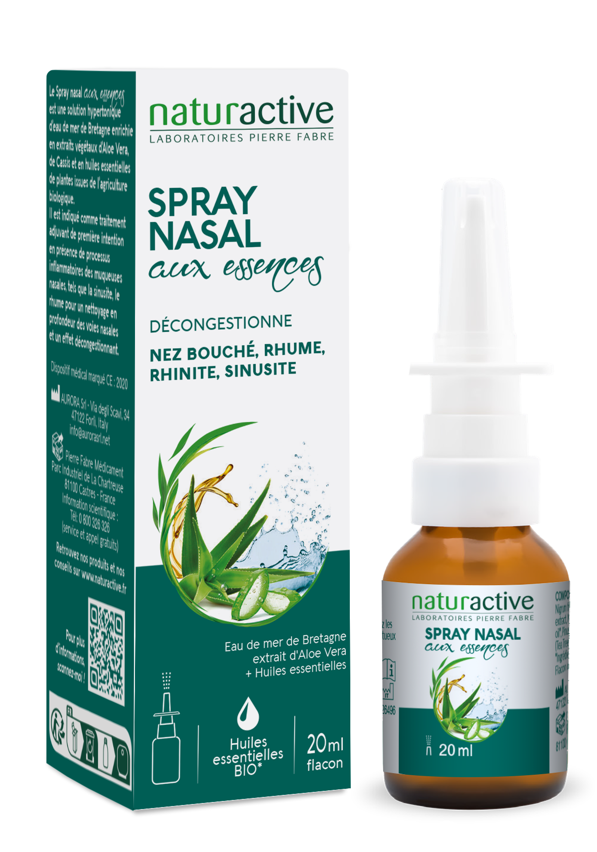 Le Spray nasal Aux Essences est une solution hypertonique d'eau de mer de Bretagne enrichie en extraits végétaux d'Aloe Vera, de Cassis et en huiles essentielles de plantes issues de l'agriculture biologique. Il est indiqué comme traitement adjuvant de première intention en présence de processus inflammatoires des muqueuses nasales, tels que la sinusite, le rhume pour un nettoyage en profondeur des voies nasales et un effet décongestionnant.