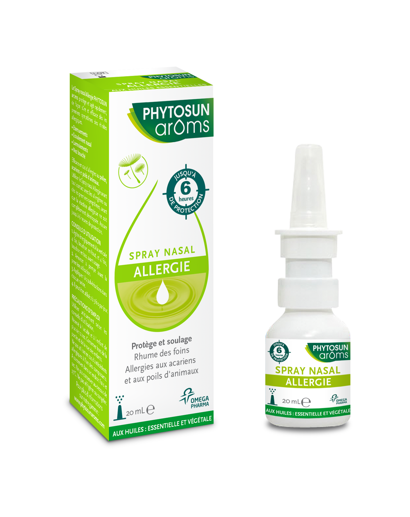 Phytosun Arôms Spray Nasal Allergie 20 ml aux huiles essentielles et végétales protège et soulage en cas de rhume des foins, allergies aux acariens, et aux poils d'animaux. De façon sûre et efficace dès les premiers symptômes, ce spray agit contre les éternuements, l'écoulement nasal, les larmoiements, le nez bouché. Il est efficace en cas d'allergies au pollen, acariens, et poils d'animaux. Sans effet de somnolence, antihistaminique, cortisone.
