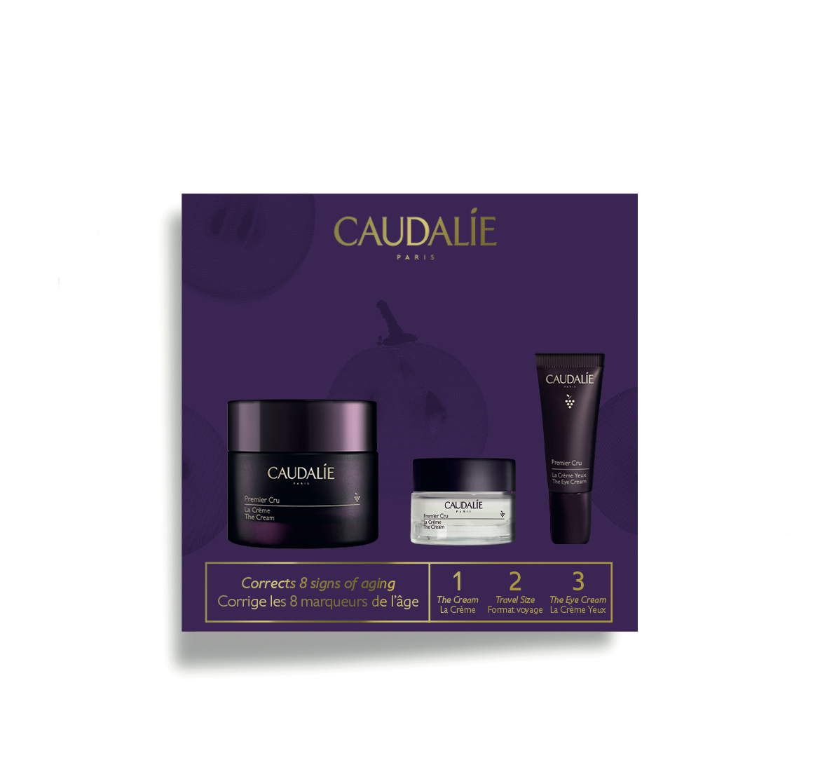 Soin anti-âge d'exception, La Crème Premier Cru est boostée par la technologie brevetée TET8™ pour corriger les 8 marqueurs de l'âge sans compromis : rides installées, ridules, fermeté, volume, élasticité, taches, hydratation, éclat. Caudalie Premier Cru La Crème Anti-Âge Global 50 ml + 2 Soins Offerts est un coffret offrant une routine anti-âge global grâce à la technologie brevetée TET8™ pour corriger les 8 marqueurs de l'âge. Il comprend une crème visage, son format voyage offert ainsi qu'une crème yeux offerte. - Caudalie Premier Cru La Crème Anti-Âge Global 50 ml + Format Voyage 15 ml Offert est un soin anti-âge qui conviendra à tous types de peau. Sa formule à la Viniférine est boostée par la technologie brevetée TET8™ pour corriger les 8 marqueurs de l'âge sans compromis : rides installées, ridules, fermeté, volume, élasticité, taches, hydratation, éclat. Les ridules sont réduites, les taches estompées, le teint éclatant. La peau est hydratée et plus ferme, elle gagne en élasticité. Les volumes du visage sont plus harmonieux. 97% des ingrédients sont d'origine naturelle. - Caudalie Premier Cru La Crème Yeux Anti-Âge Global 5 ml Offerte est un soin anti-âge qui conviendra à tous types de peau. Sa formule à la Viniférine et mélange de nacres est boostée par la technologie brevetée TET8™ pour corriger les 8 marqueurs de l'âge sans compromis : pattes d'oie, poches, rides des lèvres, ridules, cernes, nutrition, hydratation, éclat. Son embout massant décongestionne, lisse et réduit les poches pour un regard visiblement plus jeune. Cette crème agit aussi comme embellisseur immédiat grâce à la présence de nacres 100% d'origine naturelle qui illuminent instantanément le contour des yeux. Sans parfum. 97% des ingrédients sont d'origine naturelle. Sans parabènes, phénoxyéthanol, huiles minérales, PEG, silicones, ingrédients d'origine animale. Testés sous contrôle dermatologique. Non comédogène. Vegan. Fabriqués en France.