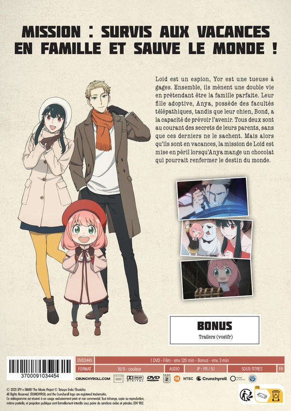 Loid est un espion, Yor est une tueuse à gage. Ensemble, ils mènent une double vie tout en prétendant être la famille parfaite. Pourtant, leur fille adoptive, Anya, est télépathe et connait leur incroyable secret, sans qu'ils le sachent. Alors qu'il prétend emmener sa famille en week-end pour profiter de l'hiver, les efforts de Loid pour tenter d'avancer sa progression dans la mission Opération Strix sont mis en péril lorsque Anya déclenche des événements qui menacent la paix dans le monde.