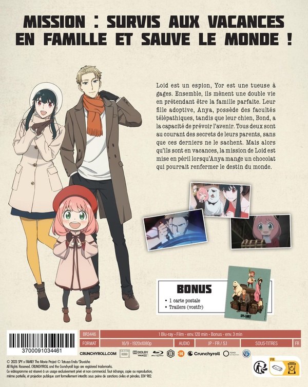 Loid est un espion, Yor est une tueuse à gage. Ensemble, ils mènent une double vie tout en prétendant être la famille parfaite. Pourtant, leur fille adoptive, Anya, est télépathe et connait leur incroyable secret, sans qu'ils le sachent. Alors qu'il prétend emmener sa famille en week-end pour profiter de l'hiver, les efforts de Loid pour tenter d'avancer sa progression dans la mission Opération Strix sont mis en péril lorsque Anya déclenche des événements qui menacent la paix dans le monde.