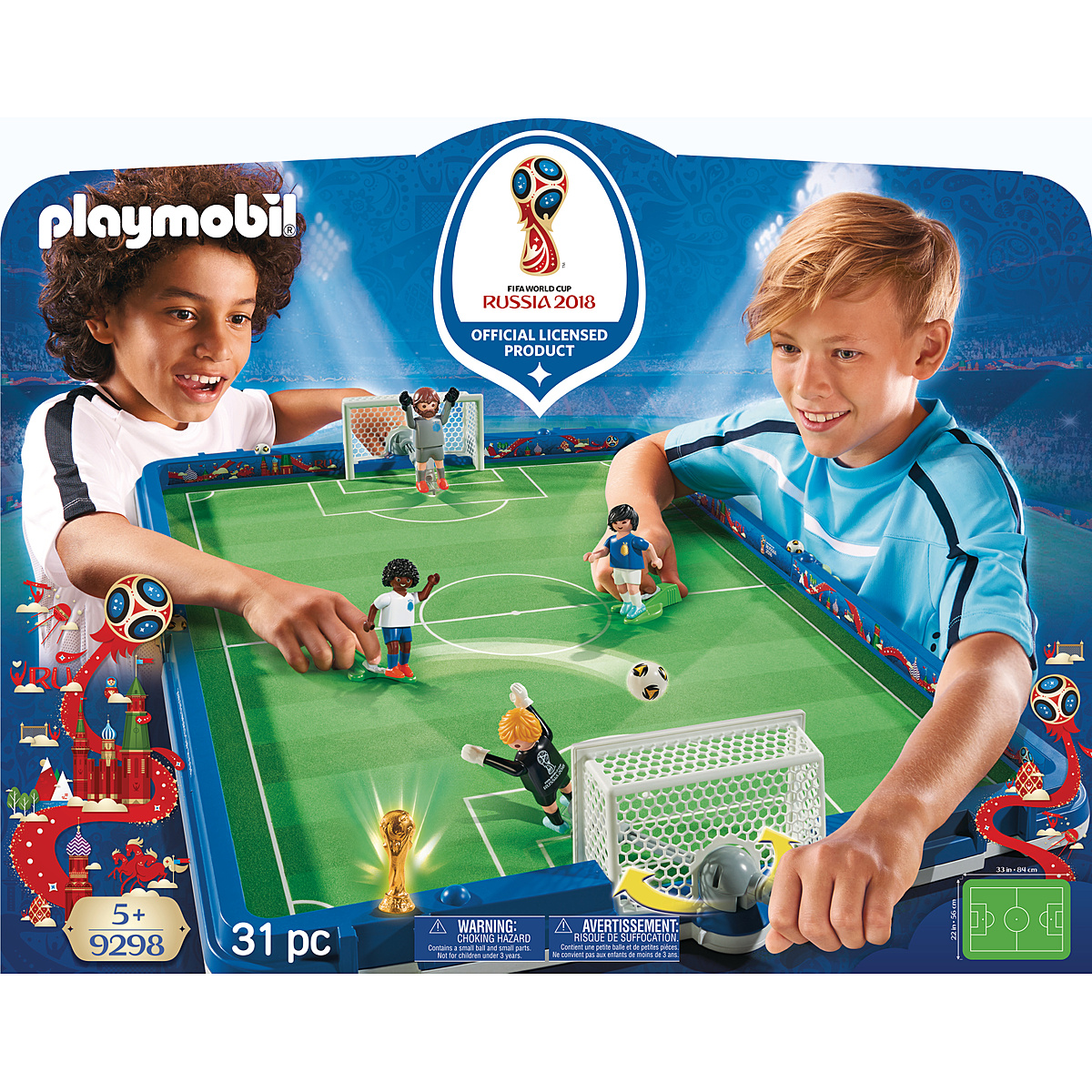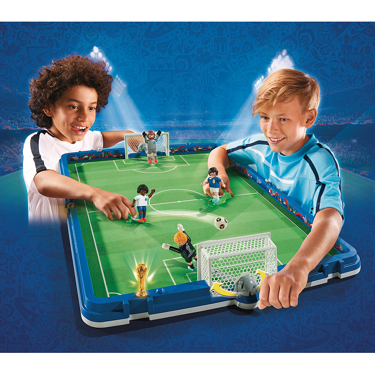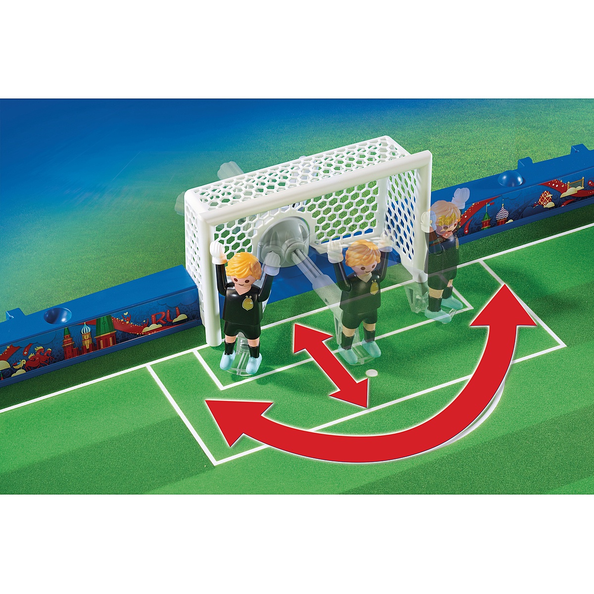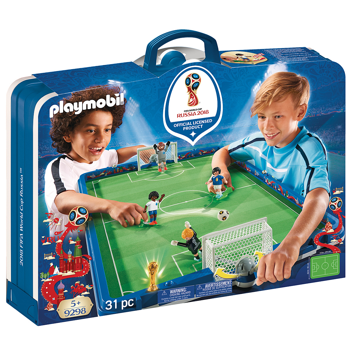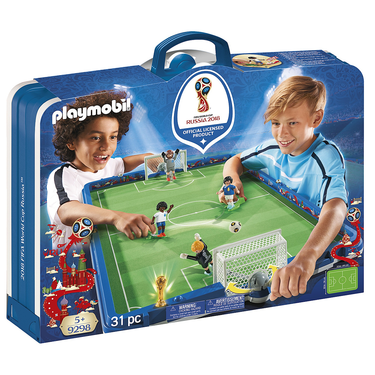 Le tournoi de football va bientôt commencer dans le Stade de foot transportable FIFA - Russie 2018 ! Les joueurs sont déjà sur le terrain. Quelle équipe remportera le trophée ? Comprend deux buts avec deux gardiens reliés à un bras pour les faire pivoter, deux joueurs de football avec jambe de tir mobile et le trophée de la Coupe du monde, à la dimension des joueurs PLAYMOBIL. Le terrain peut se plier en deux et se transformer en mallette transportable.