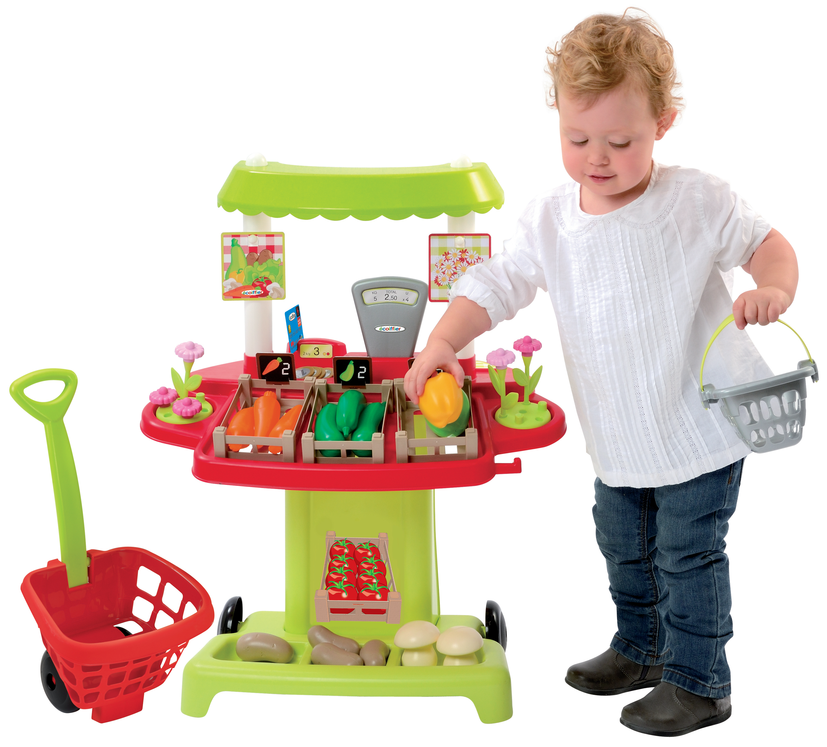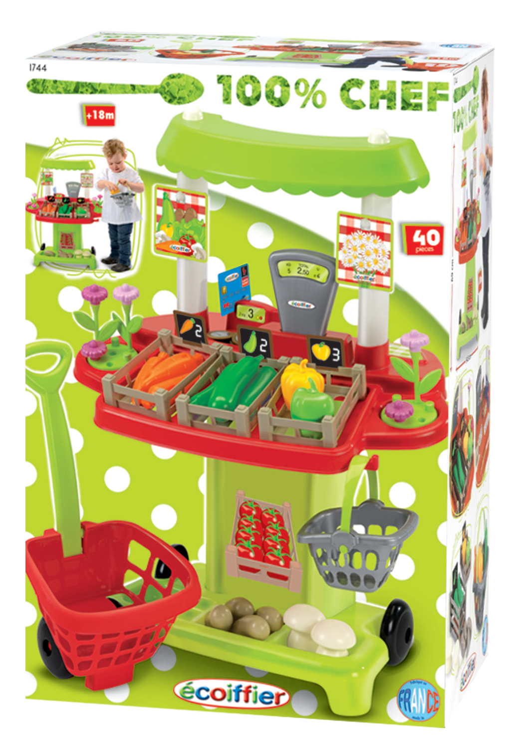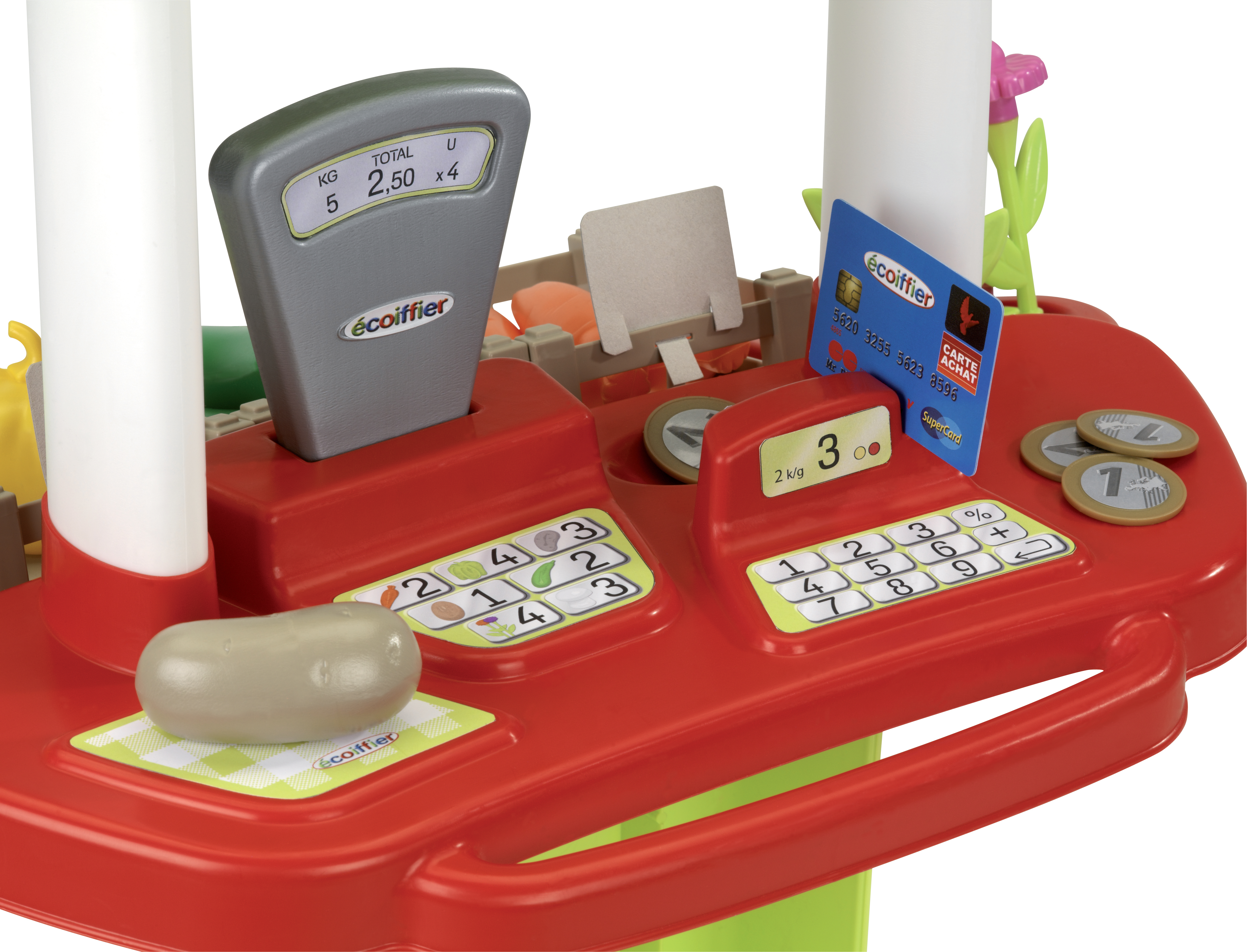 Une marchande roulante pour vendre des légumes frais en cagette ou des fleurs du jardin. Côté vendeuse, on retrouve une balance néo-rétro, un terminal carte bleue, des pièces de monnaie, et côté clients, un panier et un chariot sont à disposition. En tout, 40 éléments pour jouer dès 18 mois. Origine France Garantie.