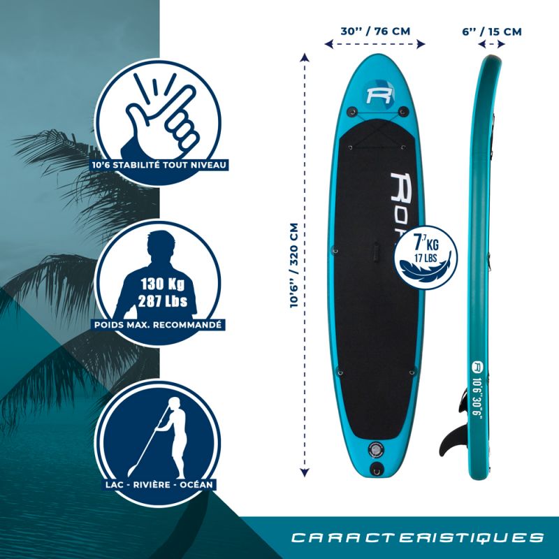 Les 76 cm de largeur (30 pouces) assurent aux différents modèles 10'6 une très bonne stabilité, pour découvrir le stand up paddle et progresser dans les meilleures conditions. Les ailerons souples latéraux sont présents pour renforcer cette stabilité dans les eaux plus agités et en surf.
