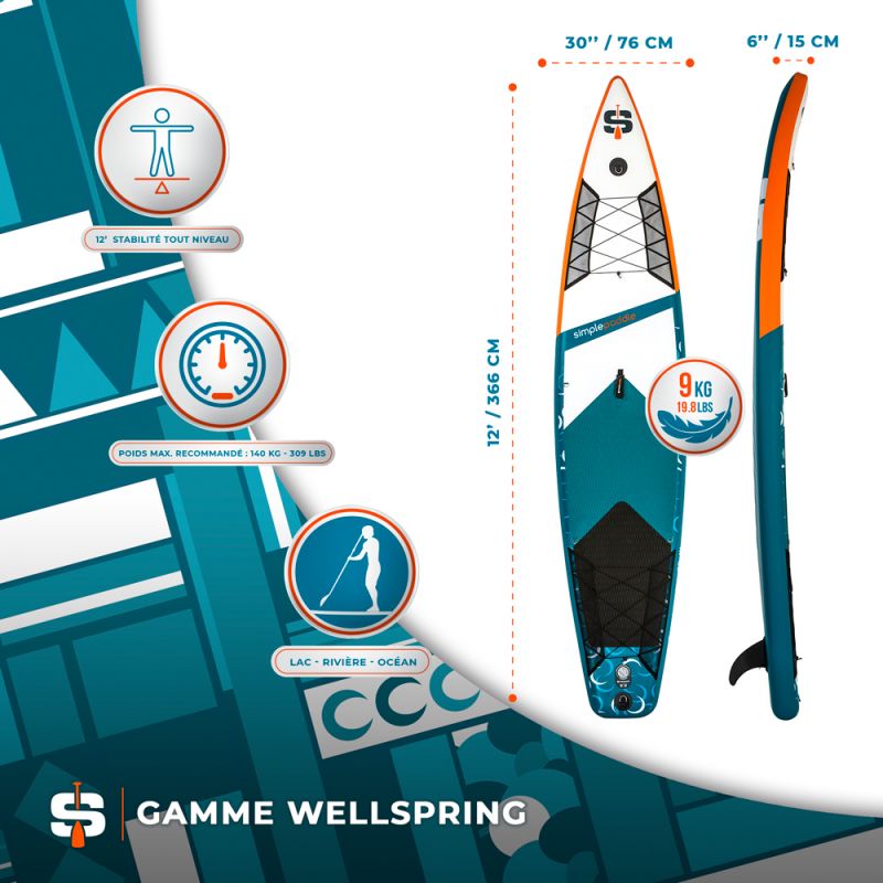 La construction en Dropstitch et le PVC apportent solidité et une grande résistance aux chocs. Il se gonfle en quelques minutes (6 à 9 minutes) avec une pompe manuelle et se transporte facilement avec les accessoires dans un sac.