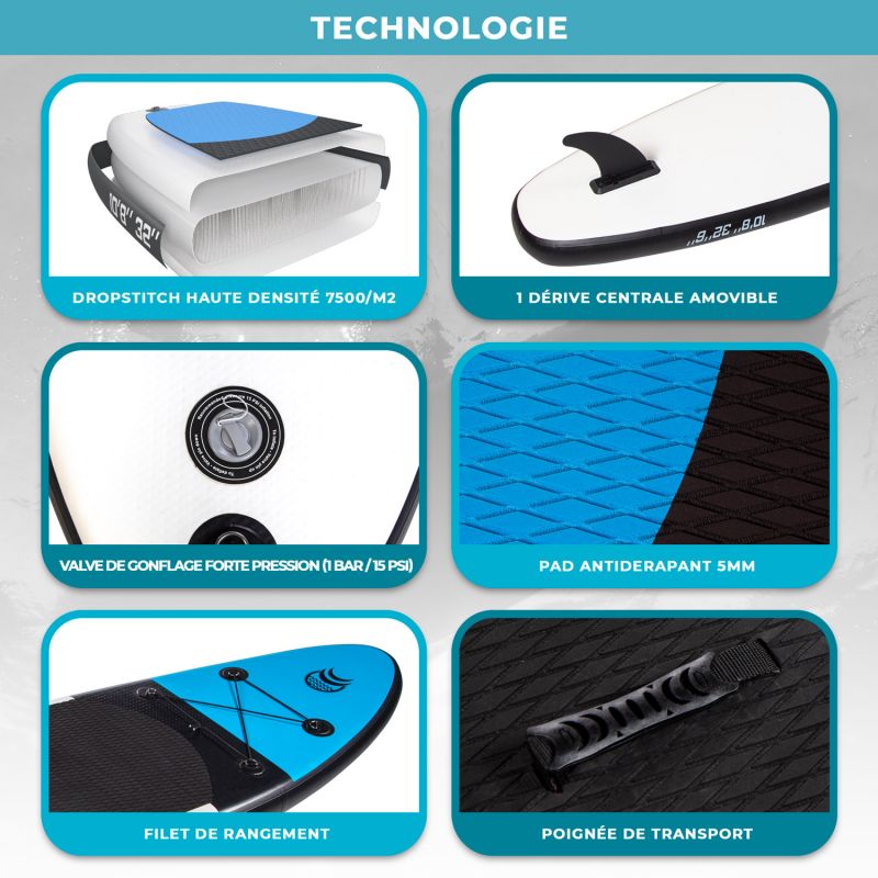 • Dérive centrale amovible avec clavette de sécurité pour diriger le stand up paddle