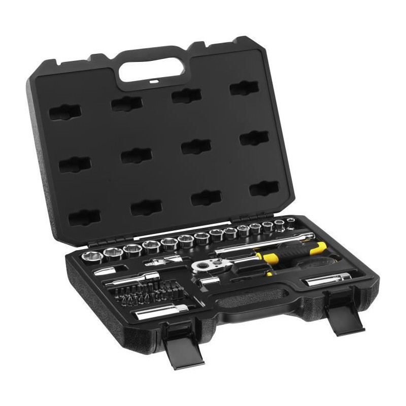 1 Cliquet 72 dents 3/8''- 14 Douilles 3/8" (6 pans) : 8 10 11 12 13 14 15 16 17 18 19 20 21 22 mm - 2 Rallonges 3/8'' : 75 130 mm - 1 Cardan universel 3/8'' - 1 Porte-embouts 3/8'' pour embouts de vissage 1/4'' - 2 Douilles pour bougie : 16 21 mm - 1 Porte-embouts 1/4'' - 1 Poignée tournevis 1/4'' - 22 Embouts de vissage 1/4'': PZ1 PZ2 PZ3 - PH1 PH2 PH3 - HEX 3 4 5 6 7 - Torx 10 15 20 25 27 30 40 - Fente 4 5 6 7 dans un coffret compact et résistant avec attaches méta