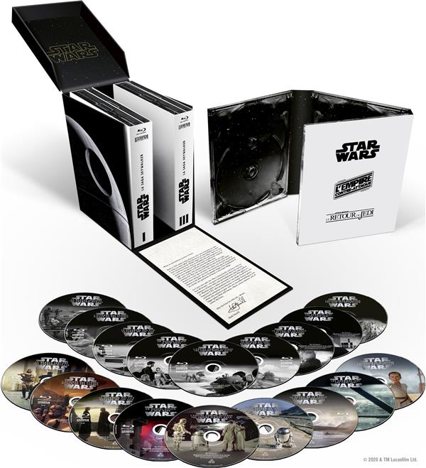 L'intégrale de la saga star wars : Episode I : la menace fantôme (+ bonus) Episode II : l'attaque des clones (+ bonus) Episode III : la revanche des Sith (+ bonus) Episode IV : un nouvel espoir (+ bonus) Episode V : l'Empire contre-attaque (+ bonus) Episodes VI : le retour du Jedi (+ bonus) Episode VII : le réveil de la Force (+ bonus) Episode VIII : les derniers Jedi (+ bonus) Episode IX : l'ascension de Skywalker (+ bonus).