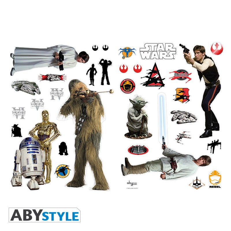 Une planche comprend de nombreux stickers, dont les personnages de Han Solo, Luke, Leia, Chewbacca, Yoda et les droïdes. Le Chewbacca mesure environ 50 cm de haut !
