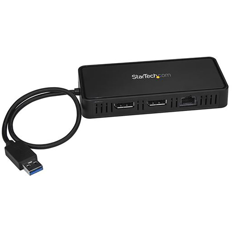 Station d'accueil pour PC portable USB 3.0 Mac et Windows® Conform aux exigences TAA Cette mini station d'accueil USB vers double DisplayPort équipe votre ordinateur USB 3.0 d'une connectivité pour deux écrans 4K à 60 Hz et LAN Gigabit. Vous pouvez ainsi tirer parti de la productivité du double affichage et de la connectivité réseau. Améliorez votre productivité avec deux écrans 4K L'adaptateur double DisplayPort ajoute deux sorties vidéo DP à votre ordinateur portable USB, avec la prise en charge d'une résolution allant jusqu'à 4K. Travailler sur deux écrans accroît votre productivité en vous offrant plus d'espace d'affichage. Vous pouvez accéder simultanément à plusieurs applications : consulter des documents de référence sur un écran tout en composant sur l'autre. Accédez à des réseaux filaires via un port GbE Les ports Ethernet sur les ordinateurs portables modernes sont rares et les réseaux sans fil sont moins sûrs et moins fiables qu'une connexion filaire. Avec le port GbE de cette station d'accueil PC portable qui dispose d'un adaptateur Ethernet, vous pouvez accéder aux réseaux LAN filaires même si votre ordinateur portable USB 3.0 ne bénéficie pas de port Ethernet. Optimisez la portabilité avec une station d'accueil PC miniature Cette station d'accueil est dotée d'un design compact parfait pour les professionnels qui ont besoin d'accessoires de bureau portables lorsqu'ils se déplacent entre plusieurs sites ou espaces de travail partagés. The StarTech.com Advantage
