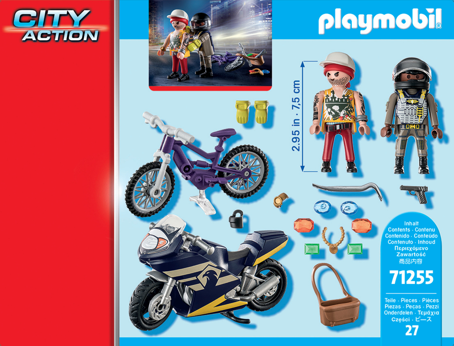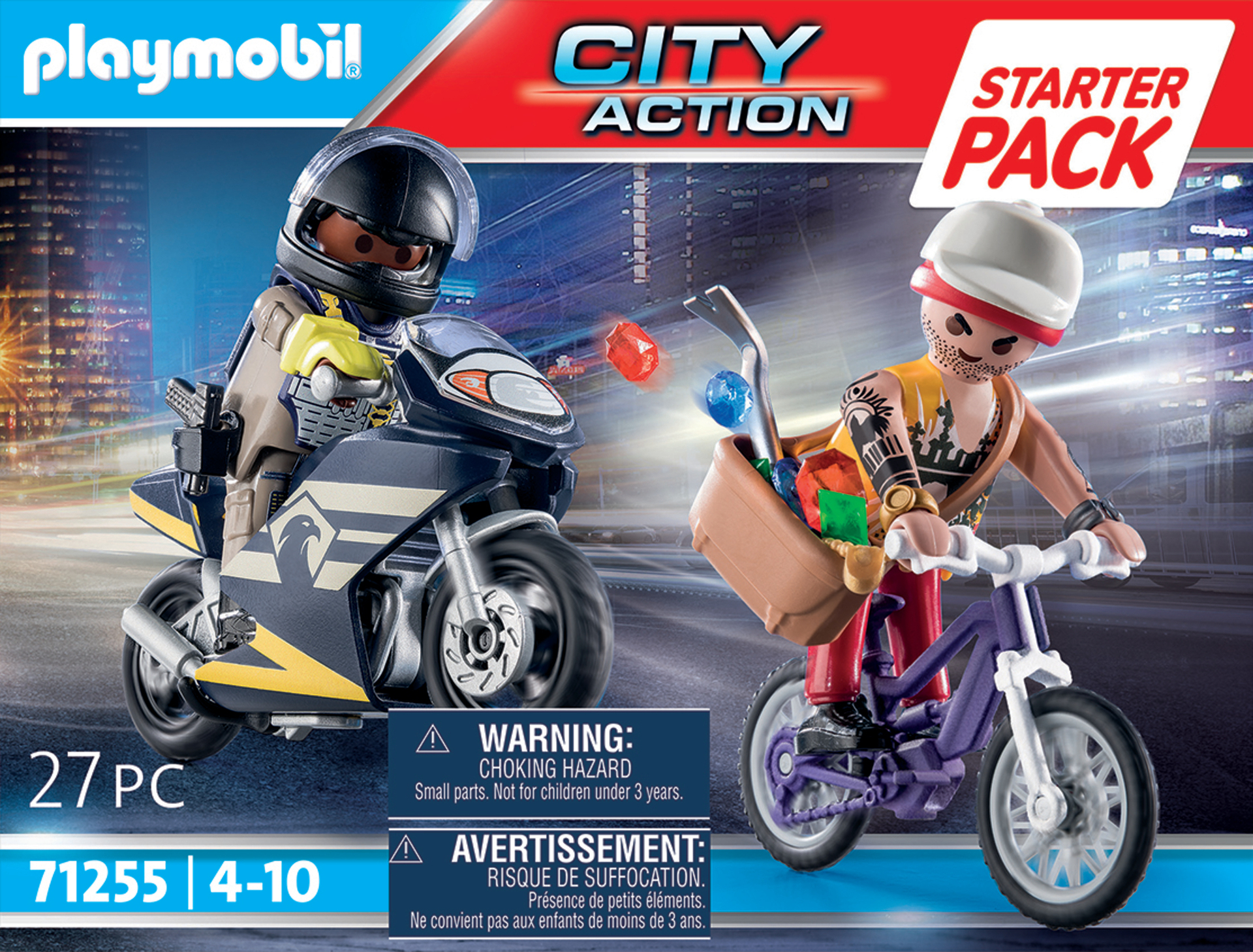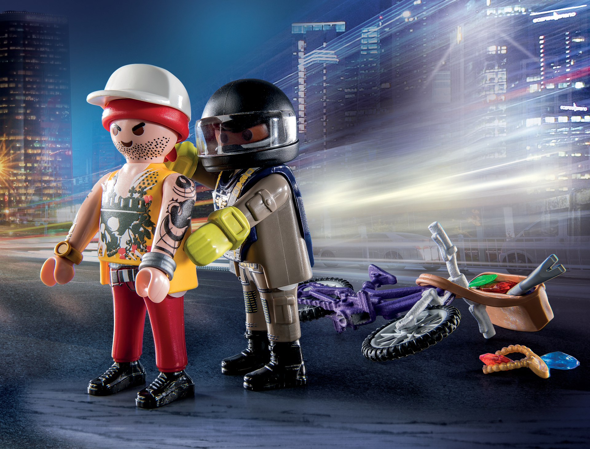 | Plus produit | Un pack idéal pour découvrir ou compléter l\'univers police de Playmobil\nUn agent, un voleur et une moto pour des courses poursuites incroyables |