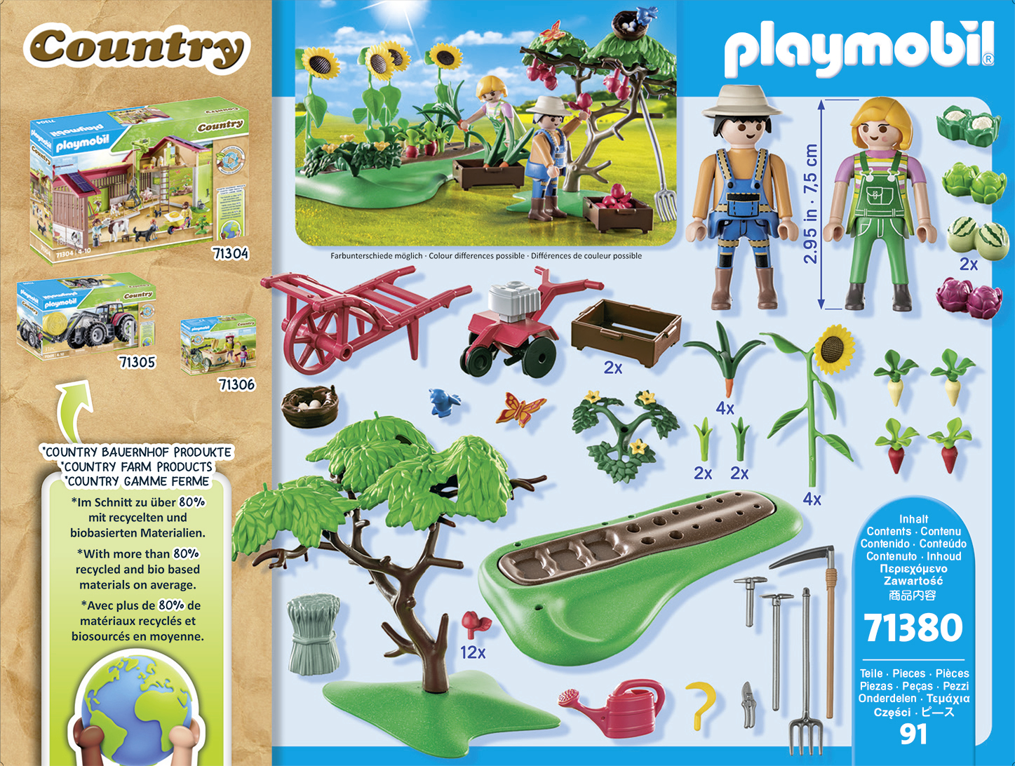 | Plus produit | Les produits de la gamme Country Ferme sont fabriqués avec plus de 80% de matériaux recyclés ou biosourcés en moyenne.\nComprend deux personnages, un homme et une femme\nAvec une brouette, une tondeuse, une fourche, un arrosoir et de nombreux autres accessoires de jardinage\nAvec un jardin dans lequel planter des tournesols, des carottes, des choux et de nombreux autres légumes\nComprend un arbre sur lequel des pommes peuvent être accrochées. |