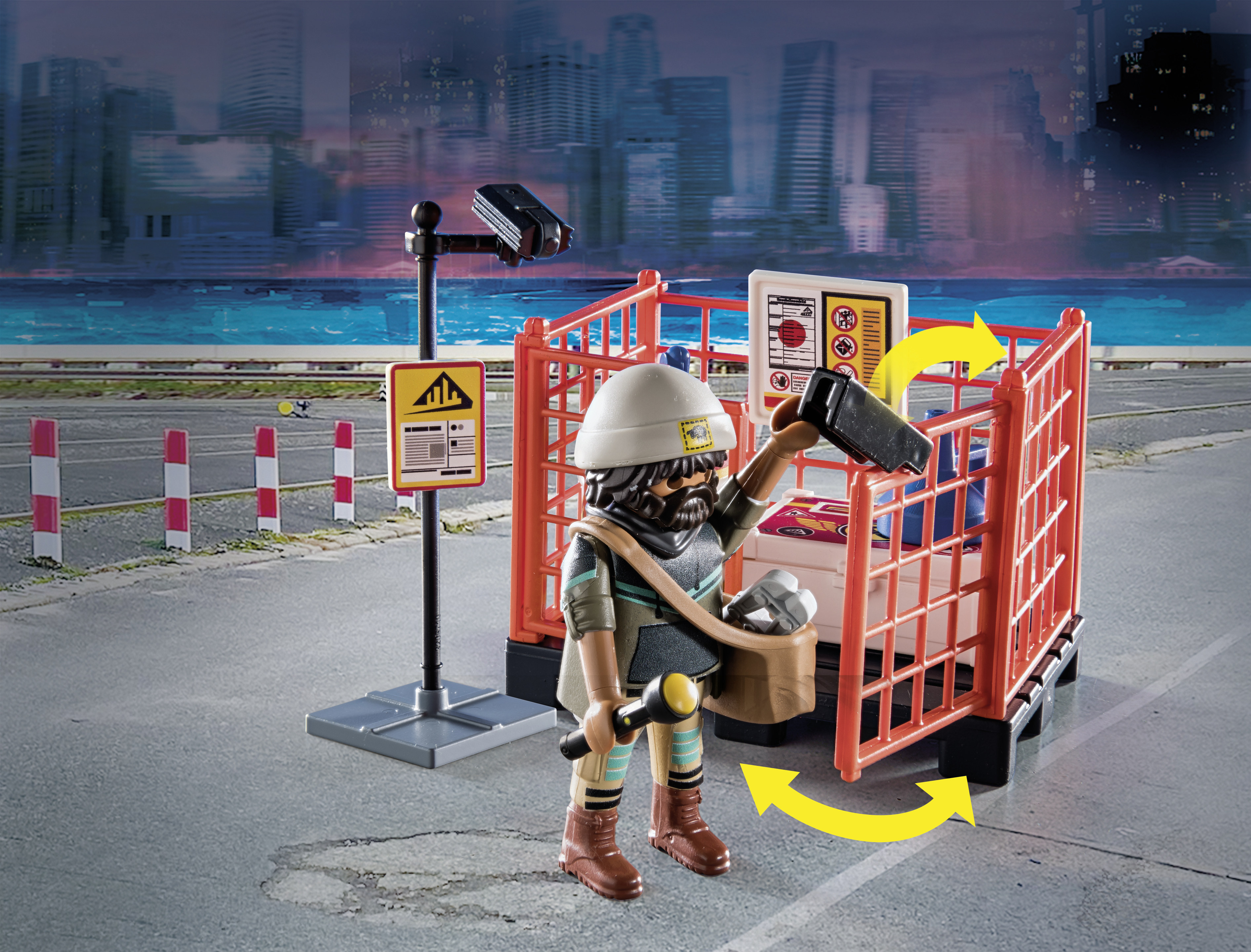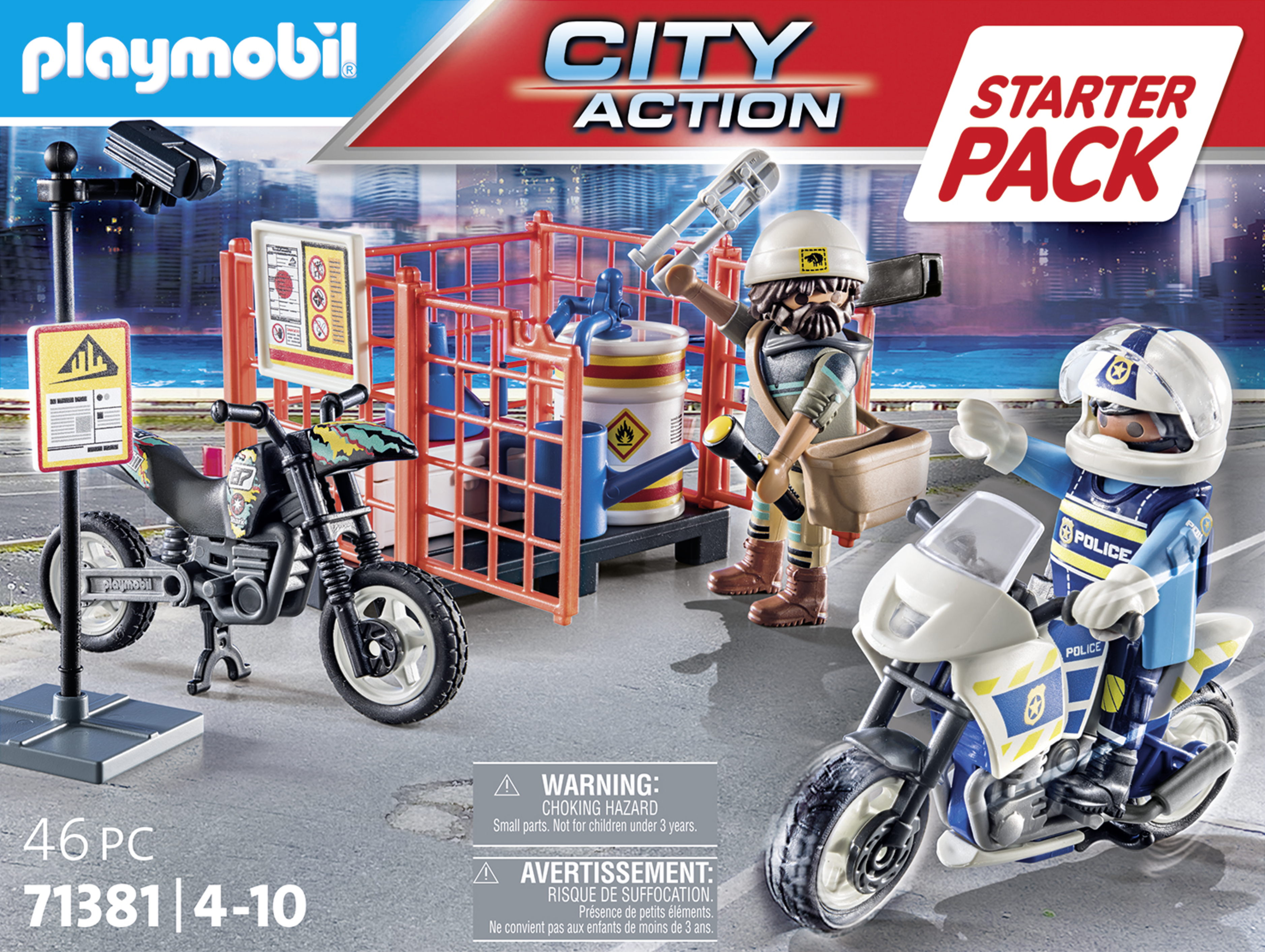 Un bandit est sur le point de commettre un méfait ! Vite, la police doit agir ! Comprend deux personnages, deux motos et de nombreux accessoires.