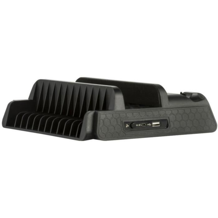 Caractéristiques : -Permet de maintenir la console à la verticale -Possibilité d'adapter le socle à la PS4 SLIM ainsi qu'à la PS4 Pro -Permet de charger 2 manettes en simultané -Ventilé par le dessous pour refroidir la console -Se branche directement à la console et dispose d'un port USB.
