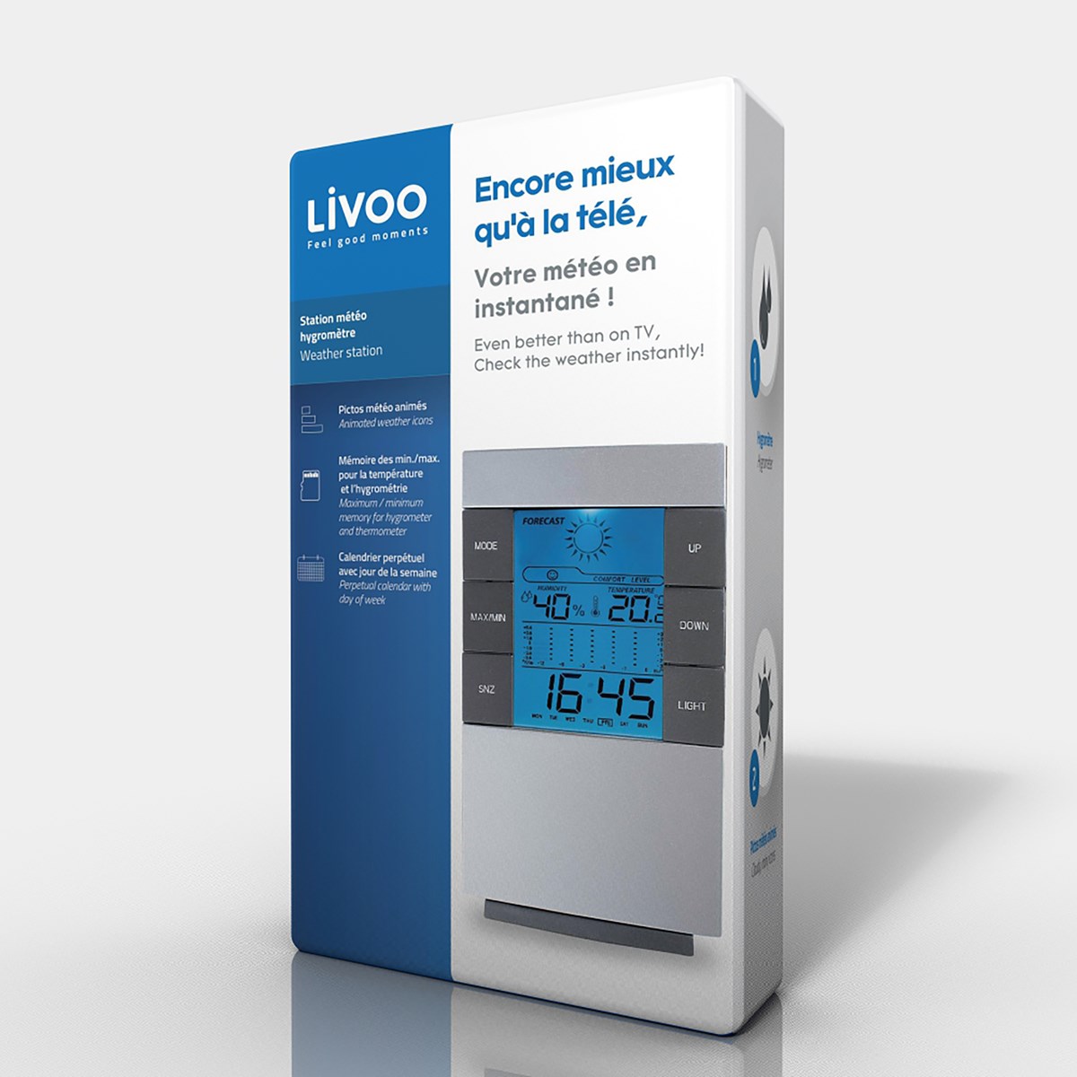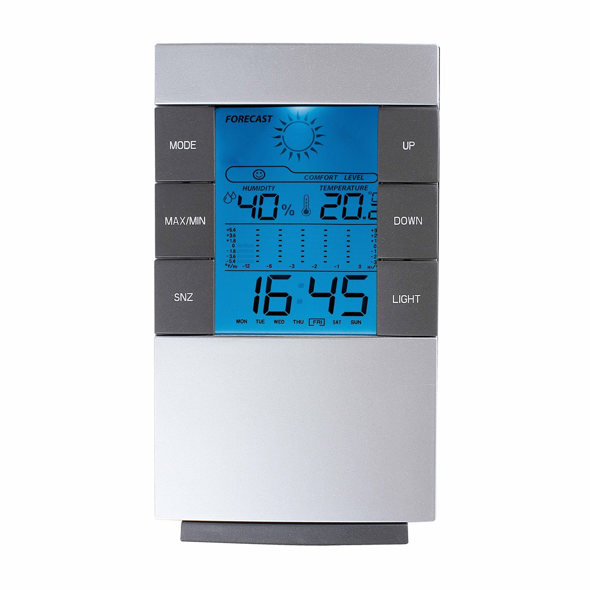 Thermomètre et hygromètre. Indication du niveau de confort. Mémorisation des températures et hygrométrie min et max. Prévisions météorologiques par pictos. Calendrier perpétuel. Horloge et alarme. Bouton snooze et lumière. Rétroéclairage bleu. Installation sur pied ou fixation murale. Fonctionne avec 2 piles R3 incluses