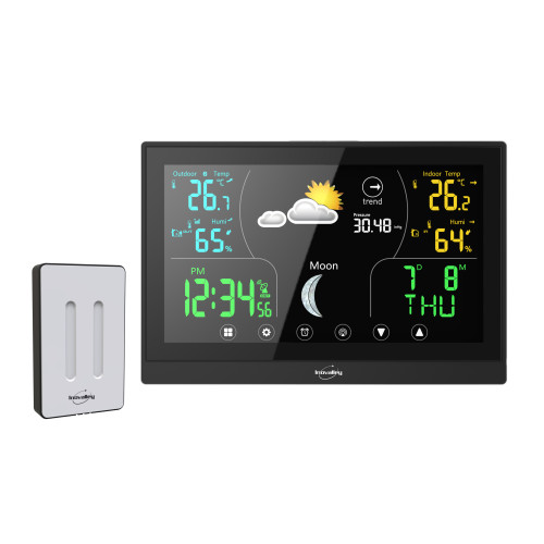 Vous disposerez d'info essentielles telles que la température et l'humidité de l'air en intérieur comme en extérieur (par sonde sans fil fournie), l'heure et la date, le tout résumé au travers d'un écran LCD haute définition et multicolore tactile..