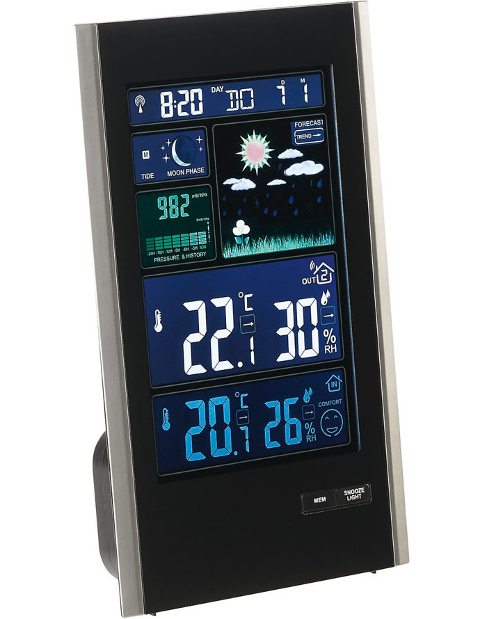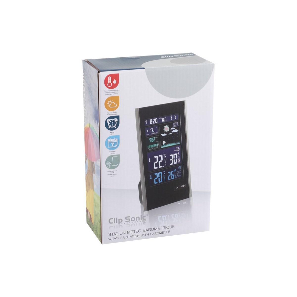 sl250 noir - station météo barométrique - Station météo barométrique radio-pilotée avec sonde extérieure sans fil Clipsonic SL250, thermomètre et hygromètre intérieur et extérieur, mémorisation des températures et hygrométrie min. et max., indication du niveau de confort et des phases lunaires, prévisions météorologiques par pictos, calendrier perpétuel, alarme, port USB pour chargement des appareils mobiles, portée de transmission jusqu?à 50 m. - Poids brut : 0.37 kg.