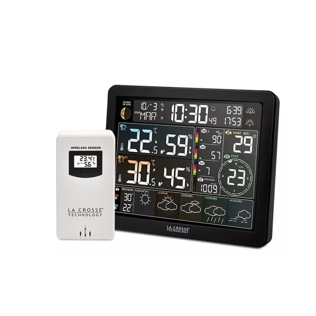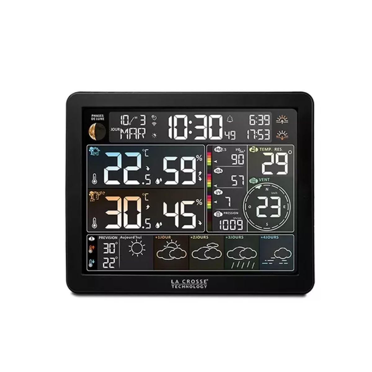 Station météo La Crosse Technology SW405-BLA avec connexion Wifi. Affiche l'heure, la date, les prévisions météo sur 4 jours, les températures intérieures/extérieures, et bien plus. Gère jusqu'à 3 capteurs externes. Idéale pour un usage intérieur, avec rétroéclairage ajustable et indicateur de piles faibles.