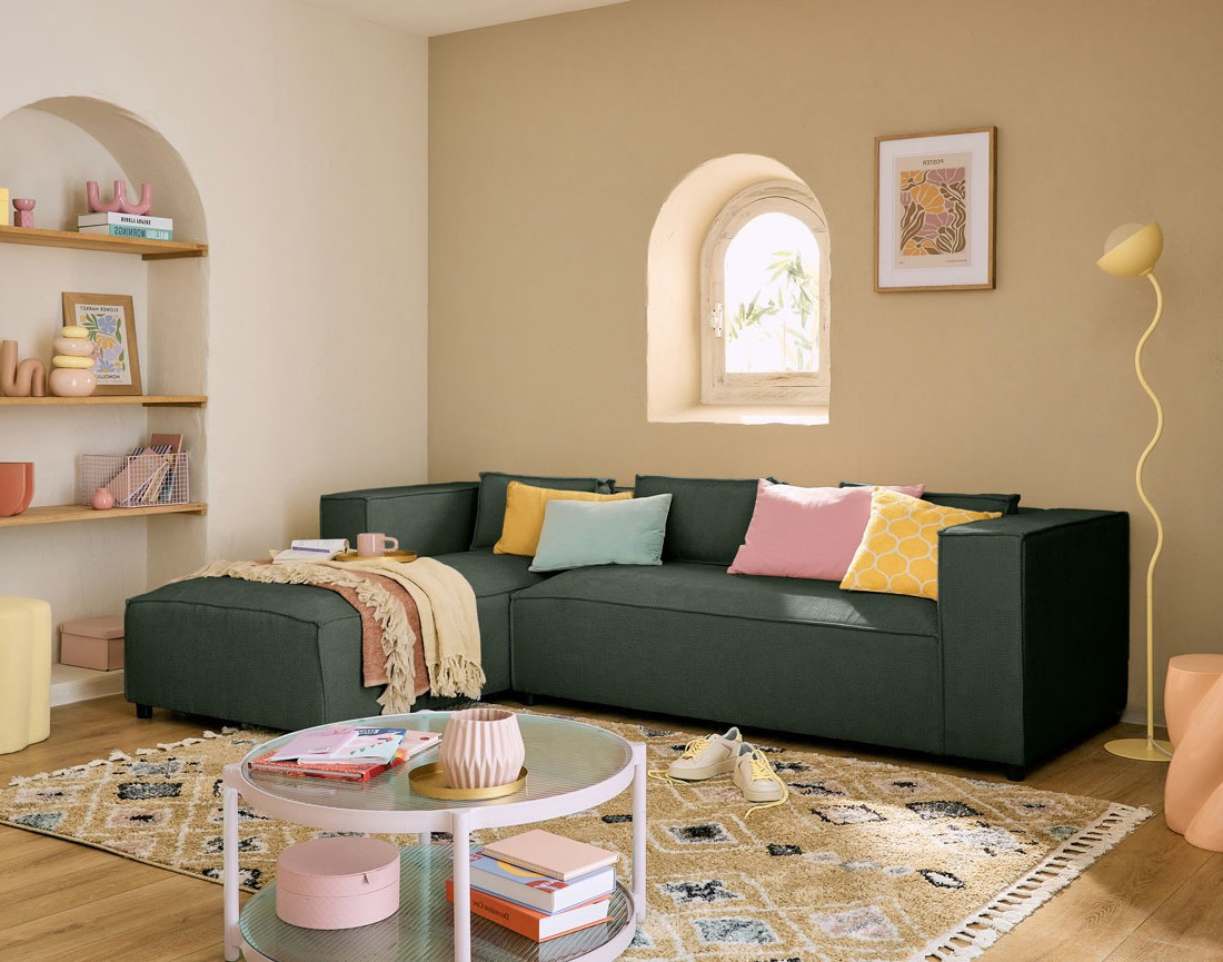 Découvrez le canapé d'angle gauche Stella. Il devient la pièce maîtresse de votre salon et attire tous les regards. Ce meuble se distingue par son revêtement en tissu texturé, très agréable au toucher. Les motifs ajoutent de la profondeur et de la dimension à votre espace. Ils viennent créer des effets visuels qui complètent parfaitement tous les styles de décoration intérieure.Avec le canapé Stella, apportez une explosion de couleurs à votre salon grâce à une palette de sept teintes. Avec des tons neutres comme le beige et le gris pour une ambiance apaisante, ou des couleurs plus audacieuses comme le terracotta, le vert olive, le vert, le jaune ou le bleu pour une touche de dynamisme.
