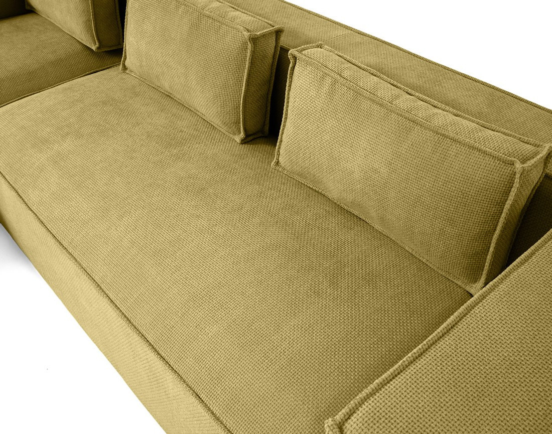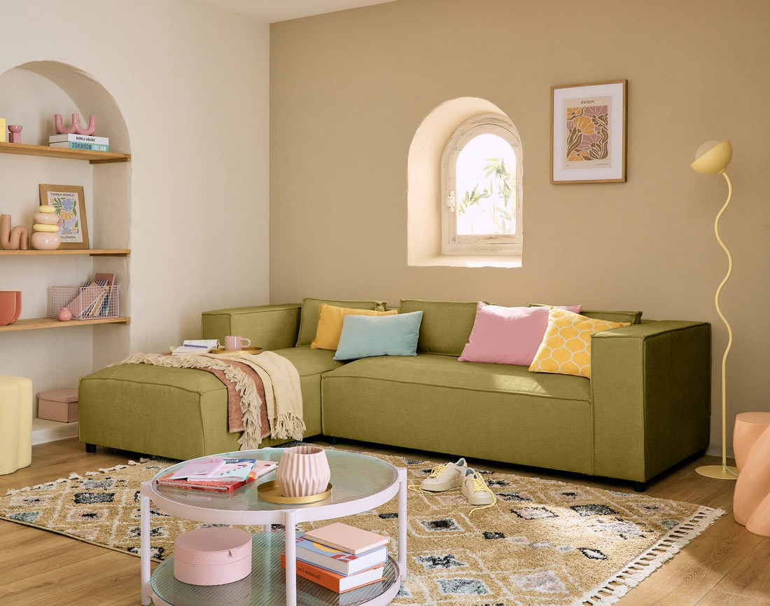 Découvrez le canapé d'angle gauche Stella. Il devient la pièce maîtresse de votre salon et attire tous les regards. Ce meuble se distingue par son revêtement en tissu texturé, très agréable au toucher. Les motifs ajoutent de la profondeur et de la dimension à votre espace. Ils viennent créer des effets visuels qui complètent parfaitement tous les styles de décoration intérieure.Avec le canapé Stella, apportez une explosion de couleurs à votre salon grâce à une palette de sept teintes. Avec des tons neutres comme le beige et le gris pour une ambiance apaisante, ou des couleurs plus audacieuses comme le terracotta, le vert olive, le vert, le jaune ou le bleu pour une touche de dynamisme.
