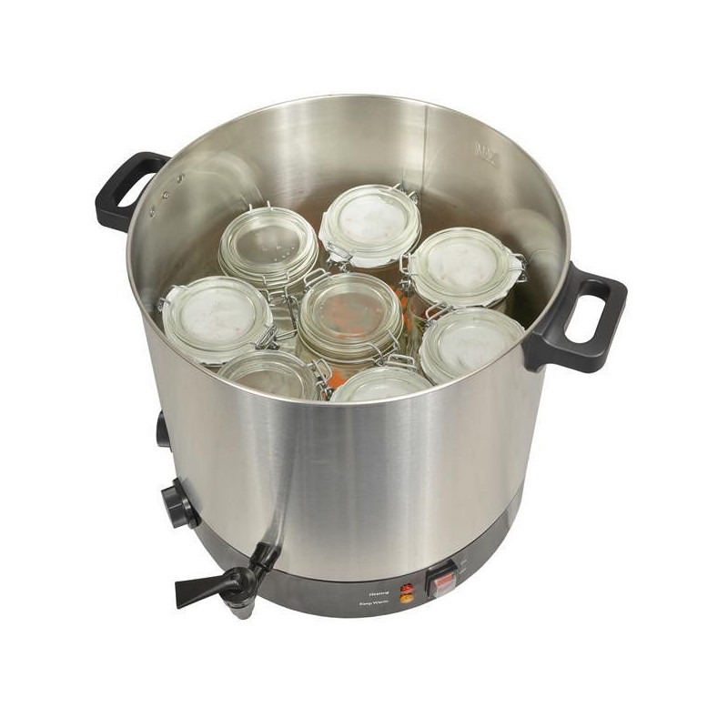 kcpst31ix - stérilisateur de bocaux électrique avec cuve inox robinet et minuteur 31l 2100w - Stérilisateur électrique KitchenChef KCPST31IX avec minuterie. Ce stérilisateur est idéal pour stériliser les bocaux, faire du pot-au-feu, de le soupe en gros volume ou encore du vin chaud....La cuve de 31 L vous offre une grande capacité de travail puisqu'elle peut contenir jusqu'à 16 bocaux de 0.5 L, 8 bocaux d'1 L ou 8 bocaux d'1,5 L.Vous pouvez cuisinez en toute sécurité grâce aux poignées thermo-isolantes. De plus, ce stérilisateur est équipé d'une protection contre la surchauffe avec un thermofusible réarmable.Panneau de contrôle simple et pratique avec un interrupteur général, un voyant de mise en chauffe et un voyant de maintien en température. De plus ce modèle est équipé d'une fonction minuterie de 120 minutes.