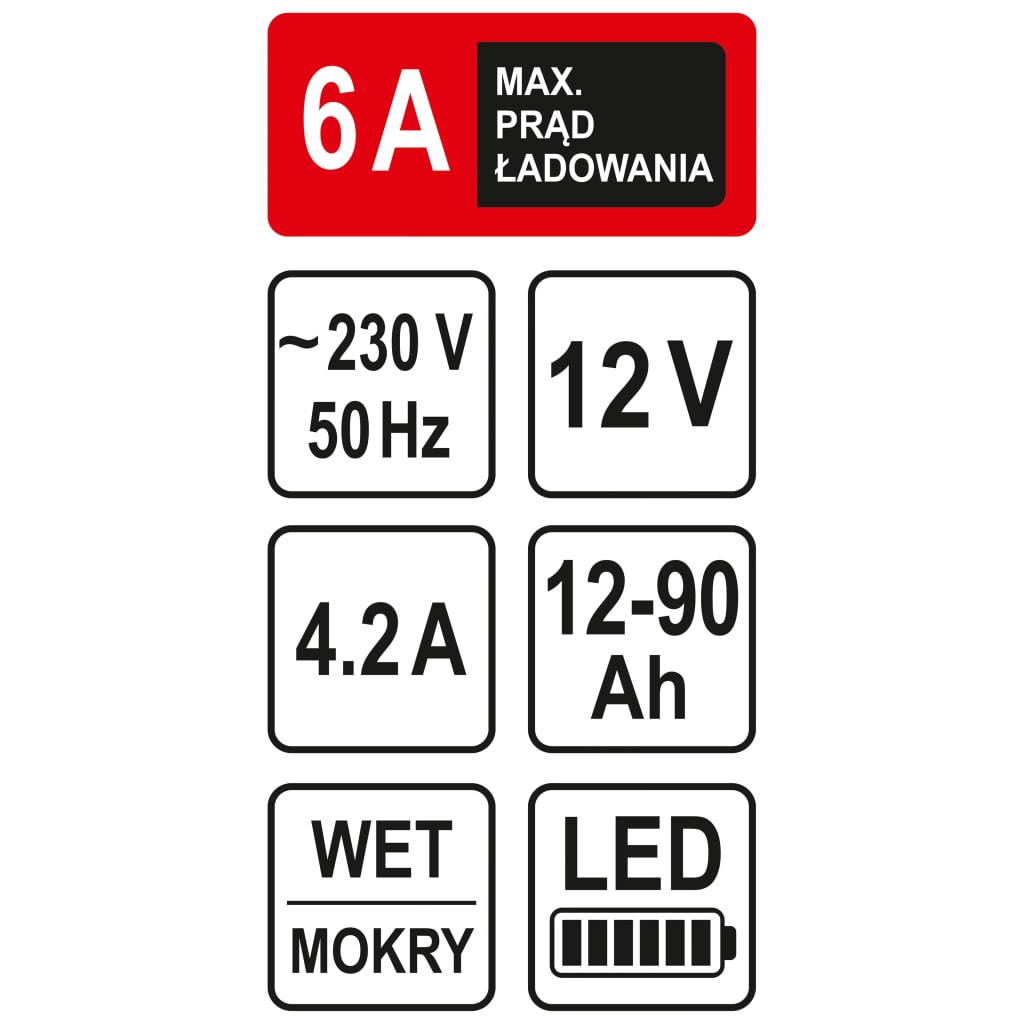 Le chargeur de batterie dispose d'une protection par fusible contre les surcharges et les surtensions. Il dispose d'un transformateur toroïdal, d'un interrupteur de courant et d'un voyant LED du niveau de charge. Le chargeur de batterie vous permet de sélectionner le courant de charge optimal.