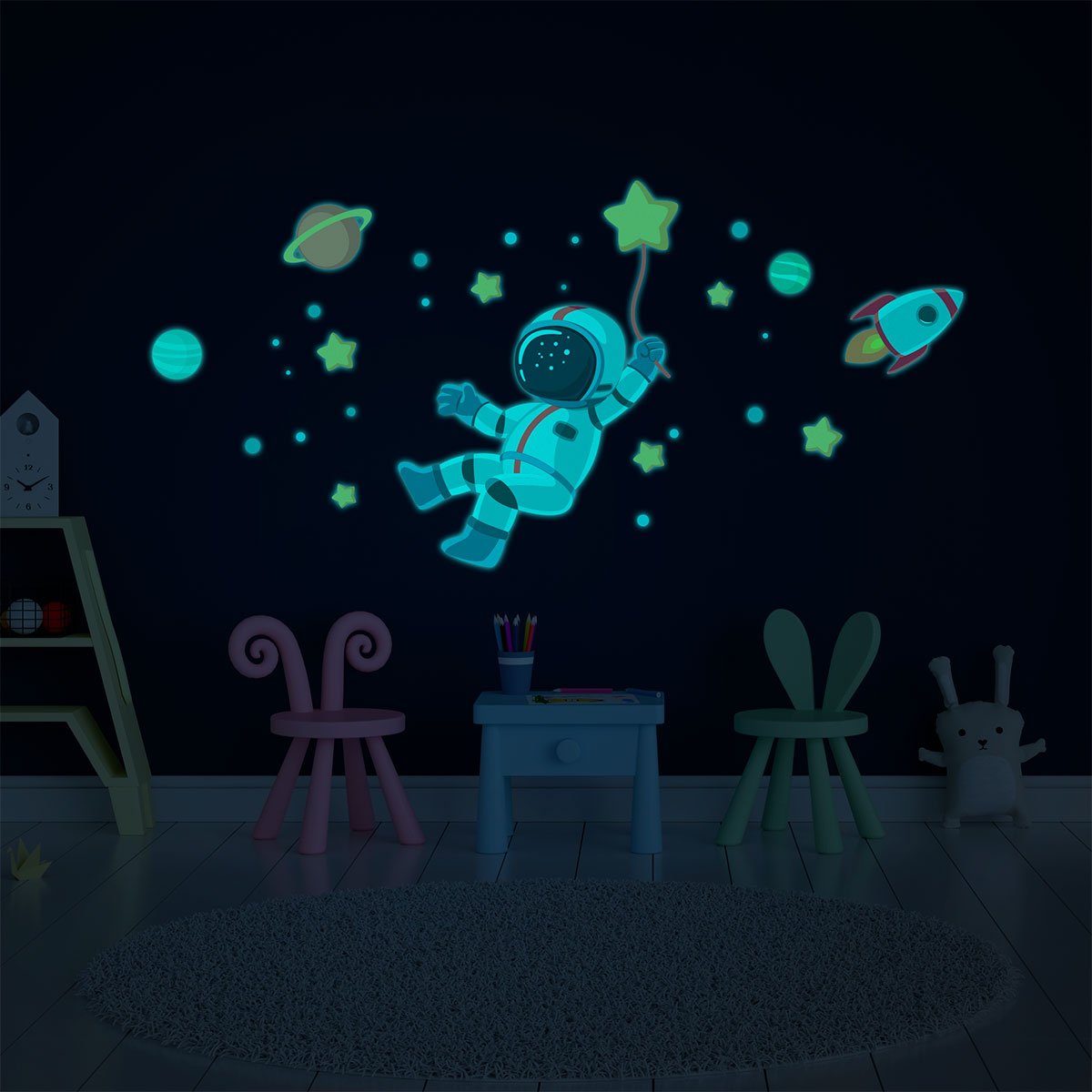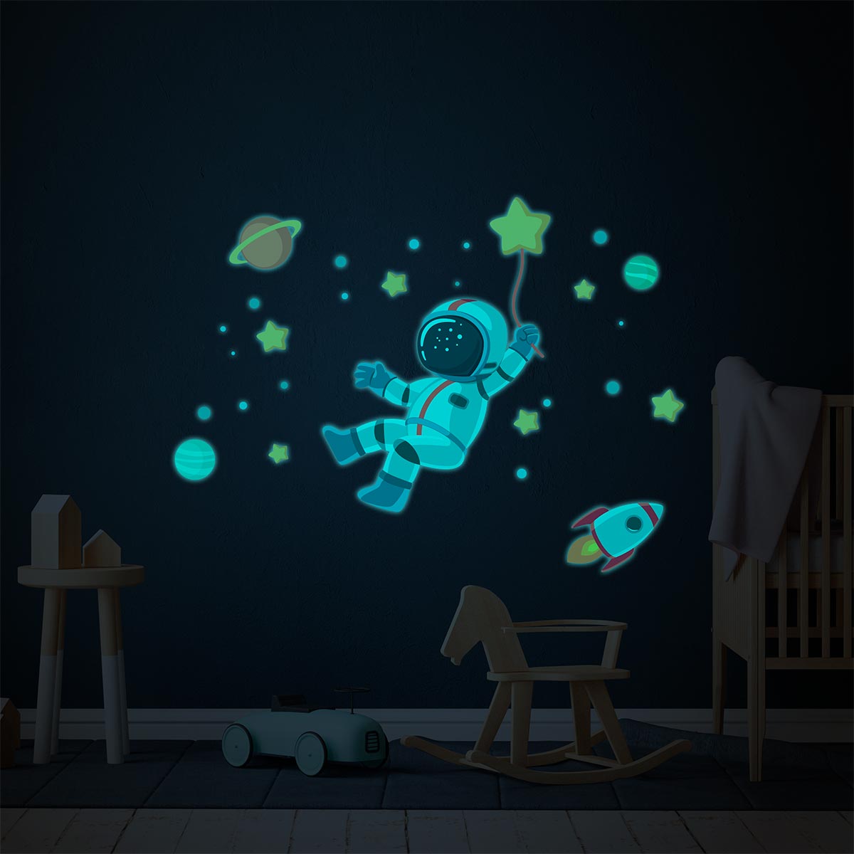 Sticker phosphorescent lumineux chambre enfant - ASTRONAUTE DANS L'ESPACE ÉTOILÉ
