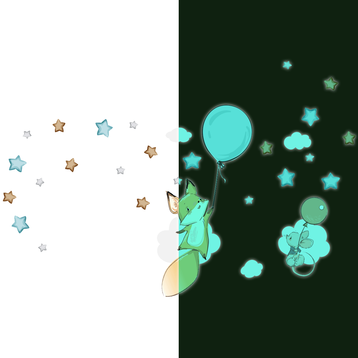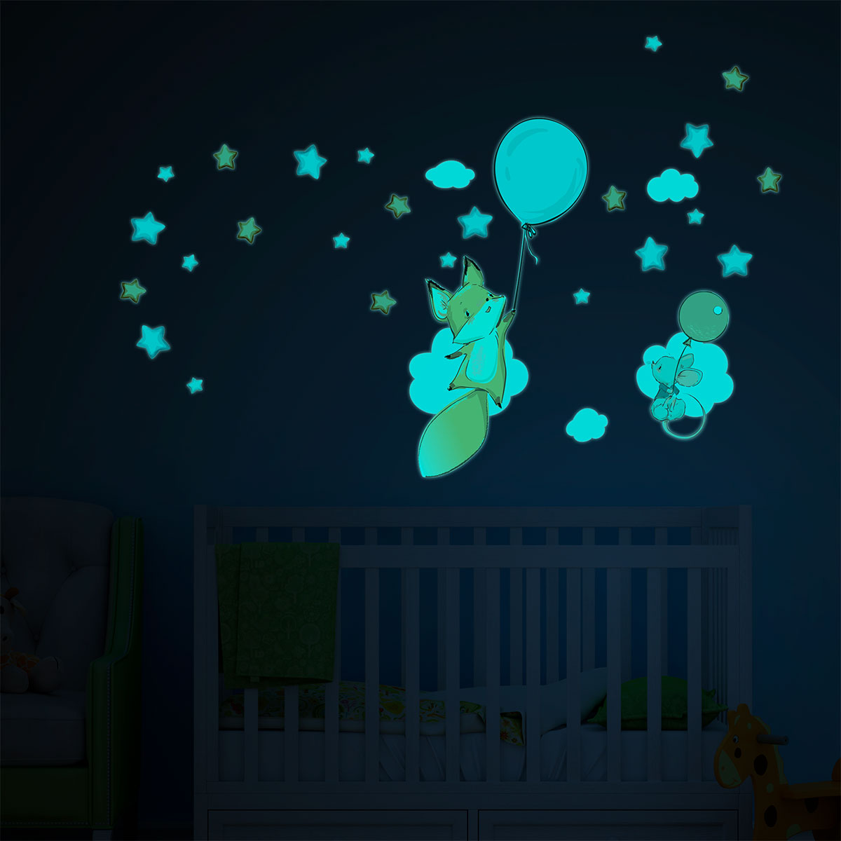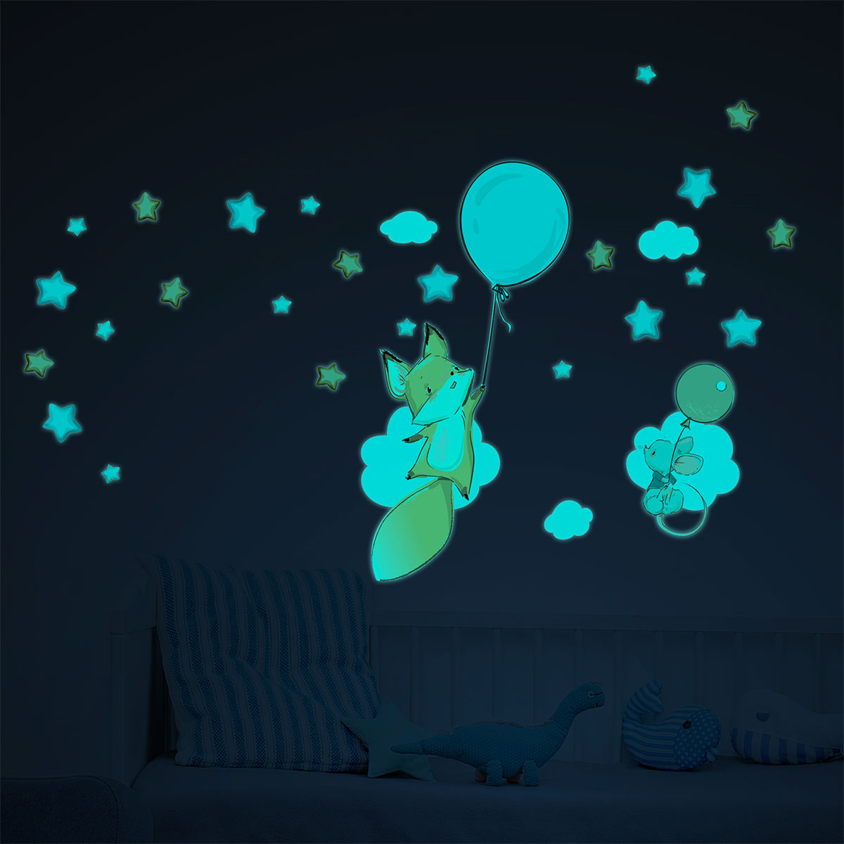 Sticker phosphorescent lumineux chambre enfant - RENARD ET SOURIS VOLANT + 80 ÉTOILES