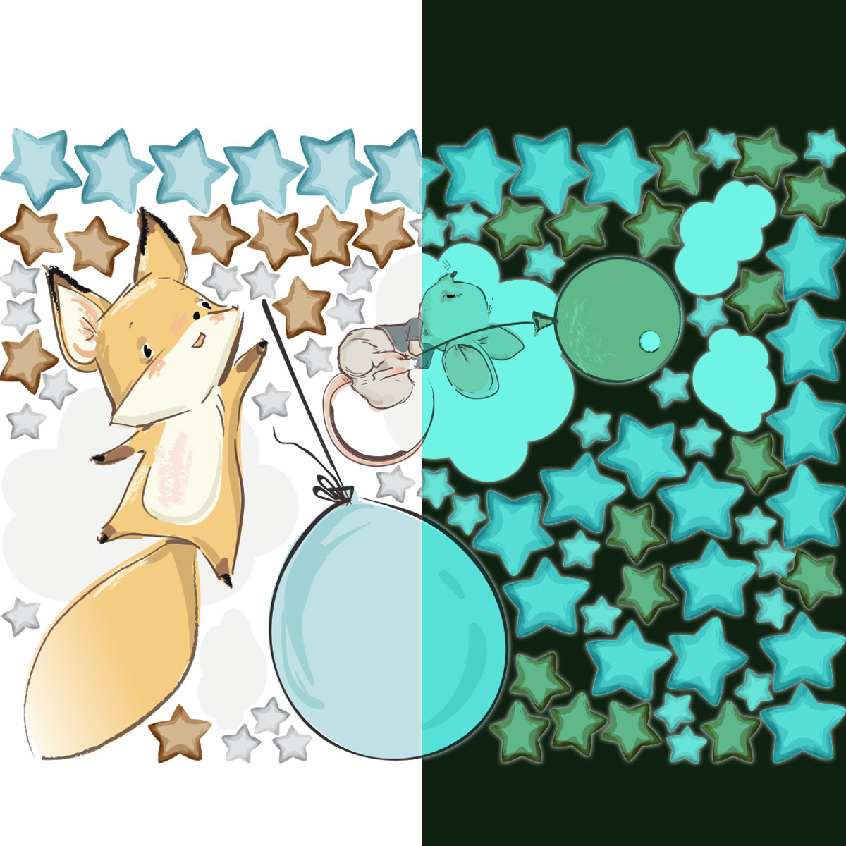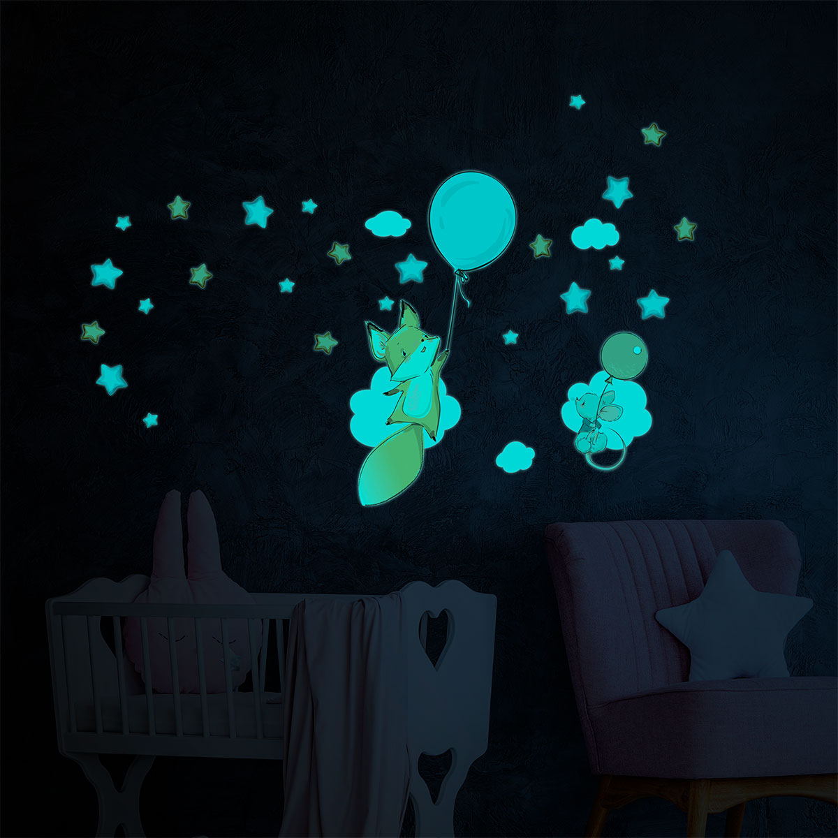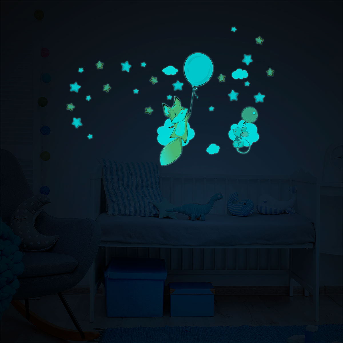 Sticker phosphorescent lumineux chambre enfant - RENARD ET SOURIS VOLANT + 80 ÉTOILES